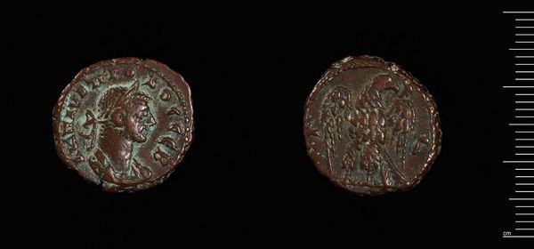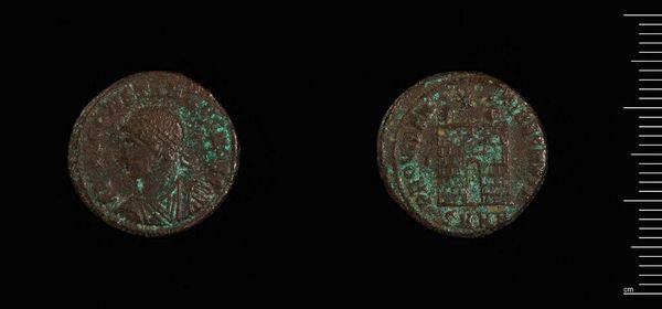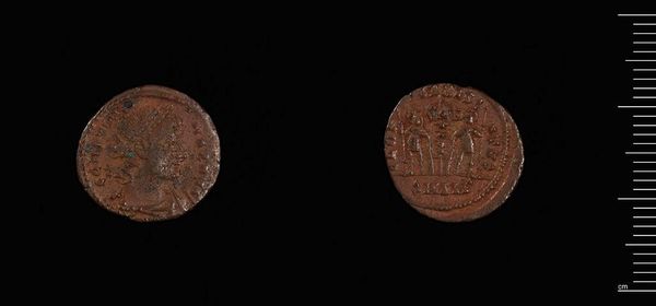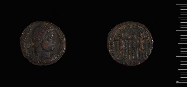 Editor: Here we have a Follis of Constantius II from Siscia. I find the patina on this coin quite striking. What visual elements stand out to you? Curator: The circular composition immediately draws the eye, doesn't it? Note the incised portrait and its mirroring on the reverse. The formal symmetry speaks to a rigid artistic canon. Editor: So, the formal balance is key to its appeal? Curator: Indeed. The coin’s value resides in its structured visual program, a closed system of imperial representation. Editor: I see! I appreciate learning about the compositional elements and how they communicate meaning. Curator: Precisely. The power is in the inherent form, a visual testament frozen in time.
