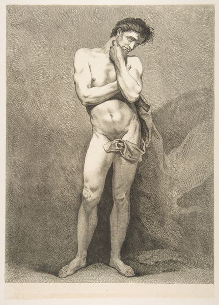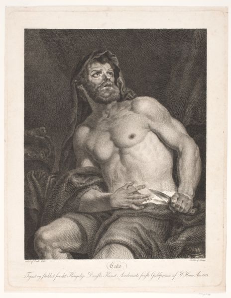 Editor: We're looking at "Cato," a print made in 1814 by Wilhelm Heuer, housed here at the SMK. It strikes me as incredibly dramatic. The stark contrast of light and shadow and the figure's intense gaze—how do you read the visual elements in this print? Curator: Let's consider the composition. The diagonal line created by Cato's body guides our eye upwards towards his face, drawing attention to his emotional state. The artist uses hatching and cross-hatching, observe closely the varied tones that add depth and volume to the figure's musculature. What about the interplay between light and shadow? Editor: It’s used to great effect. The light source seems to be above, highlighting Cato’s face, chest and hand on the knife while plunging everything else into deep shadow. This is print after all, the values seems intentionally chosen. It also adds to that dramatic effect I mentioned. Curator: Precisely. Now, think about the visual language associated with Neoclassicism. Do you see elements in this work? Editor: Yes, in the figure's idealized physique. The artist has rendered Cato as a strong man; this is an era drawing inspiration from Classical Antiquity, especially Greece, which prioritized harmony and clarity. This contrasts starkly with the violent scene unfolding, creating visual tension, no? Curator: Indeed. Heuer effectively juxtaposes these elements, which draws us into a psychological intensity. It's as if he's distilling a grand historical narrative into this moment of inner turmoil using visual vocabulary alone. Considering only what can be seen in this print, do you think he would rather not be doing this? Editor: This print makes you think, doesn't it? Considering only what can be seen makes the experience different, without context it is truly compelling. I definitely appreciate it in a new way. Curator: Focusing on its intrinsic elements does offer a powerful lens for experiencing this print, stripping away preconceptions and allows the materiality of line, form and light and the narrative figure create unique and subjective interpretations.
