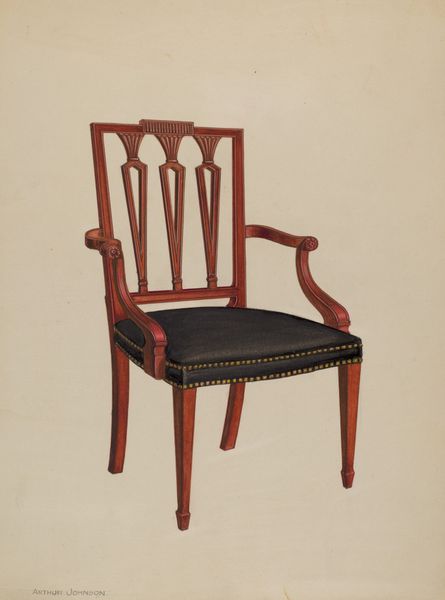 Curator: This is a Racket-back Sheraton side chair, made around 1800, now residing here at the Minneapolis Institute of Art. Editor: Ooh, sleek! My first thought is how confidently upright it stands. There’s something almost severe about it, despite the decorative flourishes. Curator: That severity comes from the Neoclassical lines so popular in late 18th-century American decorative arts. Think of it as a formal counterpoint to the fussier styles of the mid-century. Observe how the “racket-back,” gets its name, mirroring the shape of a tennis racket. Editor: Right, like a deconstructed lyre! And that palmette motif... it’s used so often, isn't it? It must symbolize something powerful? Curator: The palmette, originating in ancient Egypt, symbolizes rebirth and growth. It was favored for its formal symmetry and its evocation of classical ideals, linking the young American republic to those long-established principles. Consider its psychological impact; it was thought to instill virtues associated with those ideals—wisdom, order, and endurance. Editor: An everyday object imbued with symbolic weight... So it’s not just a chair. It’s making a statement, a silent sermon in wood! Who made this chair? Curator: The maker remains anonymous. While we can’t name a specific craftsman, the chair itself serves as a cultural artifact, representing the aspirations and values of its time. Its very design suggests it would have been placed in a room of status, signaling both taste and refinement. Editor: I like that…anonymous, yet so expressive. It carries the collective ideals, you know, almost unconsciously. Curator: Precisely. It demonstrates how objects are so much more than what they appear; they can embody cultural narratives and memories far exceeding their simple physical presence. Editor: Gives one a lot to consider simply before sitting down, eh? Curator: Indeed. Thanks to objects like these chairs we can ponder and preserve the nuances of human identity through time.