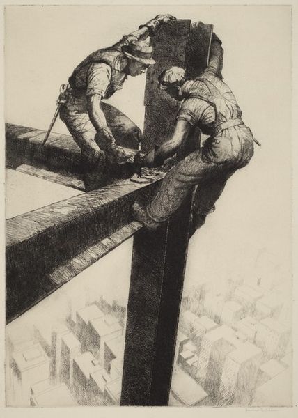 James E. Allen created "The Connectors", an etching, during the first half of the 20th century in the United States, a period marked by rapid industrialization. In this print, two shirtless men are shown working high above a cityscape. They are perched on steel beams which seem to represent a building under construction. The labor of these workers is at the heart of this image: we see their strength and endurance, but also the danger and precarity of their situation. The almost complete lack of safety equipment underscores the vulnerability of these laborers. They are largely anonymous and reduced to their muscular bodies, rather than presented as individuals with unique identities. While Allen’s etching celebrates the spirit of the American worker, it also invites us to reflect on the social and economic conditions that have shaped their lives. It encourages a dialogue about the relationship between labor, identity, and progress in the modern era.