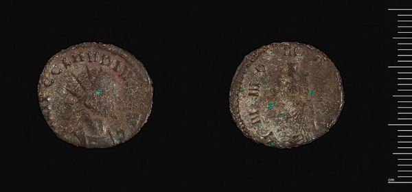 Curator: Here we have a bronze coin, identified as AE Gratian, bearing the name of the artist, Gratian, and currently residing in the Harvard Art Museums. Editor: Oh, it's gorgeous! It feels ancient and weighty with history; the patina gives it such character. I imagine it's been through a lot, bouncing in purses and pockets throughout time. Curator: Indeed. The materiality speaks to its function as a medium of exchange, reflecting the economic and social systems of its time. Mass production was facilitated by casting molds, and each coin represented a small fraction of labor. Editor: Thinking of hands touching this... Like a tiny, tangible link to the past. The portrait on one side, the figure on the other... each is a little story. It’s like holding a whisper of the Roman Empire. Curator: Absolutely. Examining the coin's distribution patterns and wear can reveal insights into trade routes, economic activity, and the extent of Roman influence. Editor: It makes you consider what small objects, everyday objects, will tell our story centuries from now. Quite humbling, really. Curator: Precisely. Such objects offer invaluable insights into the past, and perhaps a mirror to our present.