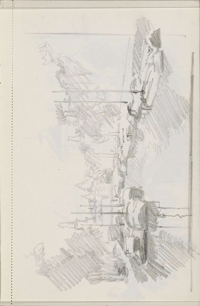Editor: So here we have a pencil drawing, *Landschap met huizen aan een waterkant*, or *Landscape with houses on a waterfront*, created by Cornelis Vreedenburgh sometime between 1890 and 1946. The first thing that strikes me is how minimal it is, almost like a memory fading onto the page. What catches your eye when you look at this? Curator: That's beautifully put. Fading memory is a perfect description! For me, it's the stark simplicity, the way Vreedenburgh captures the essence of a place with such economy of line. It feels incredibly intimate, like a glimpse into his personal sketchbook. I see the bones of a landscape, houses clustered near water. There's a strong emphasis on the vertical, don’t you think? Makes you wonder, why that compositional choice? Editor: I do see that strong verticality! It almost feels like he's emphasizing the height of the trees or perhaps the reflections in the water. Is that common in landscape sketches from this period? Curator: It’s less about commonality, and more about the artist’s vision, their individual language. I imagine him quickly jotting down these lines, trying to grasp the feeling of the place rather than creating a photographic likeness. Notice how he uses a sort of shorthand for the foliage – little zigzags that hint at leaves. Makes you think about what *isn’t* there, doesn’t it? The implied textures and the spaces in between the lines… it’s almost more potent *because* of its bareness. Editor: It's amazing how much information he conveys with so little detail. Looking at it now, it really does feel more like an impression than a detailed depiction. I guess I hadn't considered the power of suggestion in a piece like this before. Curator: Exactly! He trusts our imaginations to fill in the blanks. It’s an invitation to collaborate with the artist, to build the landscape together. And isn't that the real magic of art? It is more evocative and invites engagement and it opens our minds. Editor: Definitely! I'm starting to see it less as a simple sketch and more as a kind of atmospheric poem. Curator: An atmospheric poem… I love that! Maybe art and poetry are never that different, when they meet in expression of emotions and insights.