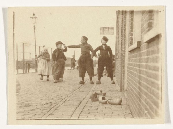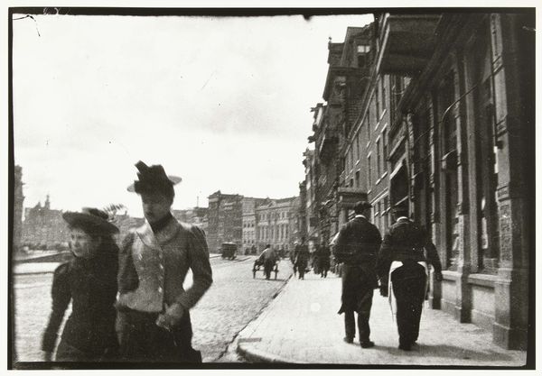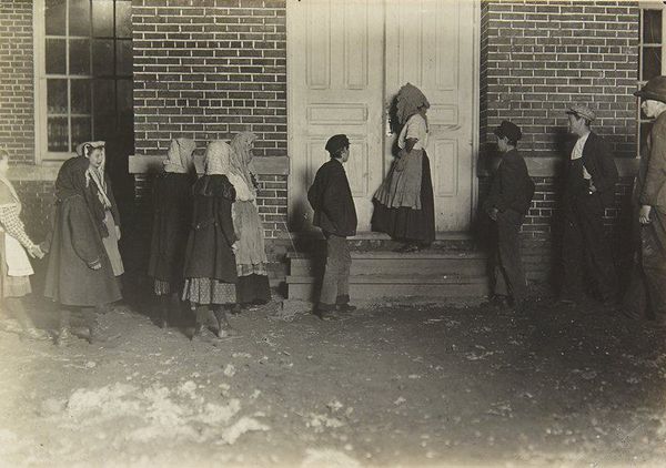 Editor: Here we have Lewis Hine's "Untitled" photograph from 1909, a gelatin-silver print. What immediately strikes me is the starkness of the setting and the girls gathered here, giving me an impression of urban isolation. What do you see in this piece? Curator: The architectural elements really frame them. The archway acts as a liminal space. They seem to be caught between worlds, doesn't it feel like that? Not fully outside, not fully inside. It makes one consider the transitional stage of childhood these girls inhabit. Editor: Absolutely, that resonates! What about the girls' postures? Curator: Look at the symbolism: they’re in proximity but almost averted. They're sharing a common reality. Yet, one is embracing another in tenderness. Consider Hine’s broader project as a social documentarian, what symbolic message is revealed with these children? Editor: He was photographing child labor, wasn’t he? It's disheartening to see innocence possibly linked with exploitation here. The building, looming, possibly symbolizes industrial forces? Curator: Precisely! Hine consistently utilized photographic imagery to trigger reform and recognition of child welfare, focusing attention on the social challenges that marginalized youth encountered during the early 20th century. Editor: Understanding Hine's mission really changes how I view this image, turning it from a simple scene into a powerful commentary. Curator: Yes, isn’t it amazing to contemplate how photographs serve as historical mirrors reflecting both societal challenges and shifts in our moral compass? It carries a deep emotional memory and a sense of urgency for a more compassionate society.