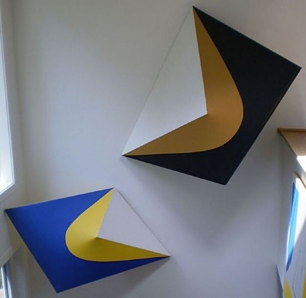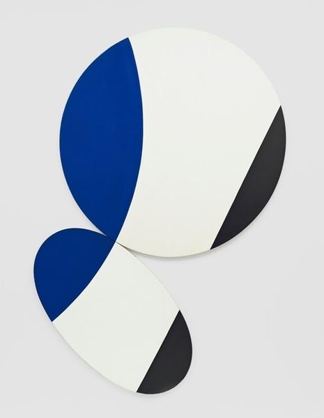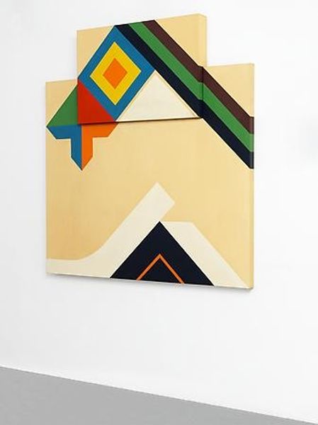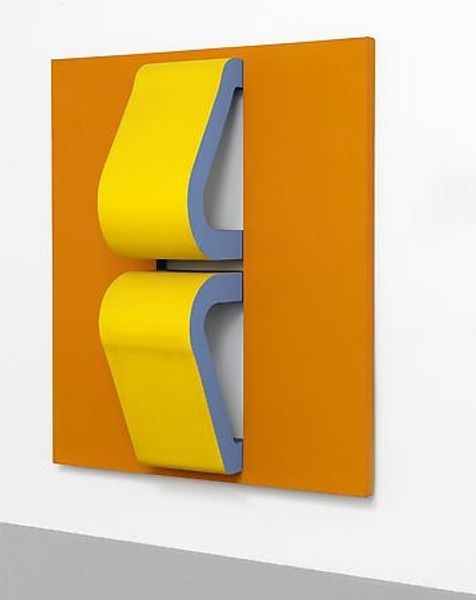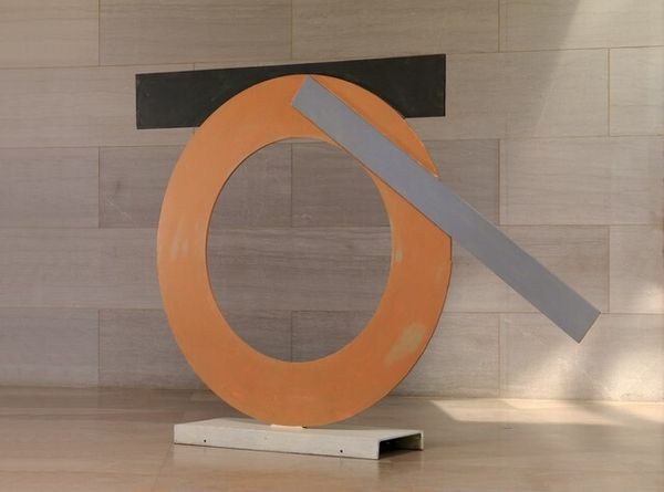Curator: Right, let’s take a closer look at Sven Lukin’s “Trafalgar” from 1965. What are your immediate impressions? Editor: Stark. Almost aggressively clean. The limited palette – greys, blues, that startling band of orange – it all feels very deliberate, calculated. It almost doesn’t want to be touched. Curator: It's mixed media, actually; that sense of flatness you're picking up contrasts interestingly with its sculptural presence. Lukin builds out from the painted plane. Editor: Ah, I see it now! It tricks the eye. And it's that combination, that playful subversion of material, that intrigues me most. Knowing the labor, I am trying to find hints of it. I see sanding marks and edges that speak to the artist's interventions, those places feel like a kind of poetics of the process. The way materials can shift and bend under intentional manipulation. Curator: I think you're right that the imperfections elevate it somehow. It almost makes me wonder if "Trafalgar" isn't just about shapes but about tensions and how different elements relate, kind of fighting for the spotlight. Like our relationship with geometry; do we try to bend it to our will, or do we acknowledge that it has a life, a voice of its own? Editor: In that case, Lukin seems torn! Are we meant to believe it is hard-edged or that it comes off of the painting to fall into the third dimension. Which reading do you believe takes more attention? Curator: That duality, for me, is the most delicious part. It's this dance between minimalism and something almost playful, a sort of secret language whispered between the shapes. I'd bet that there's no specific way in which to read the object. It leaves room to have our individual interpretation, and it welcomes the mess. Editor: So, rather than finding the 'truth' in materials, as I might often argue, this allows materials to remain plural, and subjective, informed by experience, or simply, whatever baggage we arrive with. It makes process personal. Curator: Exactly! So what started as seemingly cold becomes oddly inviting. Editor: The thing continues to grow on me. It might just make me reassess my notions of postminimalism... perhaps the cold is where the warmth really lives.