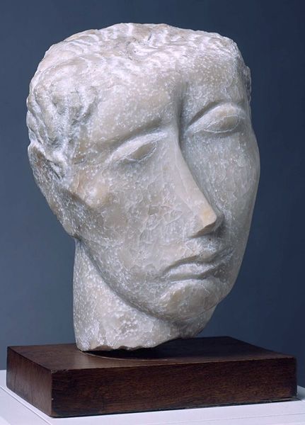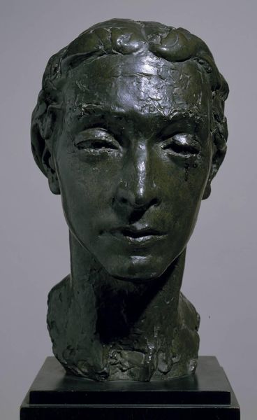 Curator: We're standing before Milița Petrașcu's sculpture "Alchetron", a striking bronze portrait head. What strikes you most about it at first glance? Editor: Melancholy. Profound, almost crushing melancholy. The downturned eyes, the subtle slump of the mouth...it feels like looking into a well of unspoken sorrow. And the texture somehow amplifies it. Curator: Precisely. Note how the bronze's patinated surface, though dark, catches the light to accentuate the subject’s brow and cheekbones. The effect of chiaroscuro emphasizes the sculptural forms—generating a sense of classical restraint. Editor: Restraint, yes, but that restraint seems almost forced, as if the sorrow is held in check by sheer willpower. Is it just me, or is there something…vulnerable, maybe, in the slope of the neck? Almost a silent question. Curator: Indeed. Although classified as figuration, this rendering pushes past mere representation; it delves into something fundamentally human. See, for example, how the smoothness of the skin around the mouth contrasts with the textured hair that adds a dynamism that animates the entire piece. Editor: I wonder who she was imagining when she made it. Someone lost? Some lost piece of herself? I bet you, at night when all the people are gone, and she gets quiet… the stories come back, real strong. The little whispers of other voices...or that one clear voice…maybe she has a touch of Edgar Allan Poe too... I mean this is deep! Curator: And deep portraits resonate profoundly within the canon precisely because they crystallize complex subjective realities using objective aesthetic languages—light, line, form. In "Alchetron", Petrașcu’s capacity to manipulate our emotional response via expertly judged modeling provides us insight into that potential Editor: Right? Okay...well, whatever that story is... it feels too sacred to unearth... all art should evoke emotion, whether the artist means to, or whether just their own emotional expression gives form and vitality to it. And, this one really grabbed me! Curator: An astute closing. Let's move on.