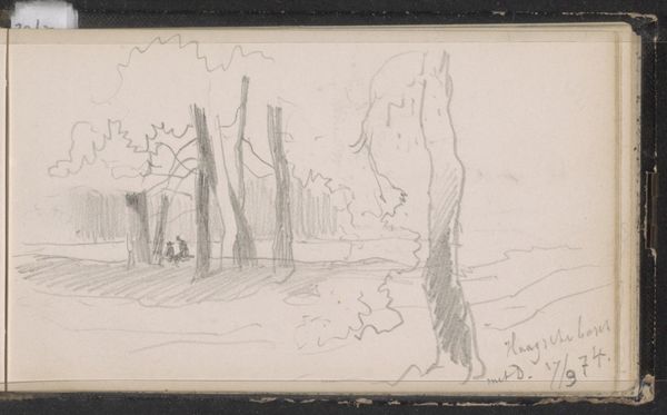 Johannes Tavenraat created this drawing, Kerk te Doorwerth en figuren op een landweg bij Heelsum, with graphite on paper. At first glance, the composition divides into two distinct registers: an elevated landscape scene and a closer view of Doorwerth church among rooftops. The upper scene features a cluster of figures seated beneath a tree, sketched with loose lines and minimal detail, evoking a casual, pastoral feel. The landscape is rendered with broad, horizontal strokes that suggest depth and distance. Below, the church and village roofs are drawn with slightly firmer lines, offering a clearer, more intimate perspective. The drawing plays with the formal contrast between expansive vistas and concentrated architectural details. This contrast invites us to consider how Tavenraat juxtaposes the public and the private, the natural and the built, reflecting contemporary interests in landscape, national identity, and the picturesque. Ultimately, the loose, sketch-like quality suggests a study, an exploration of form and perspective rather than a finished statement.