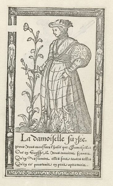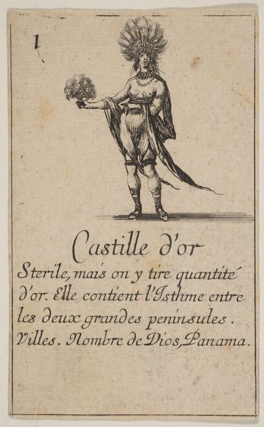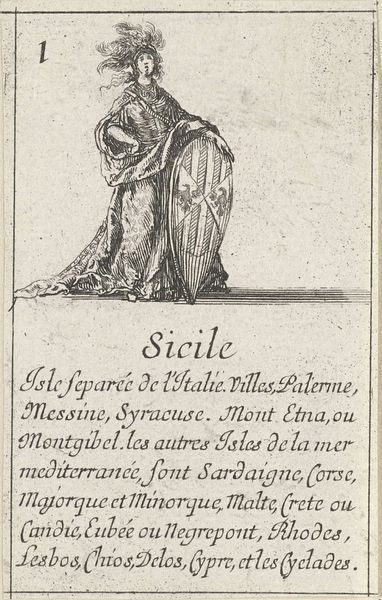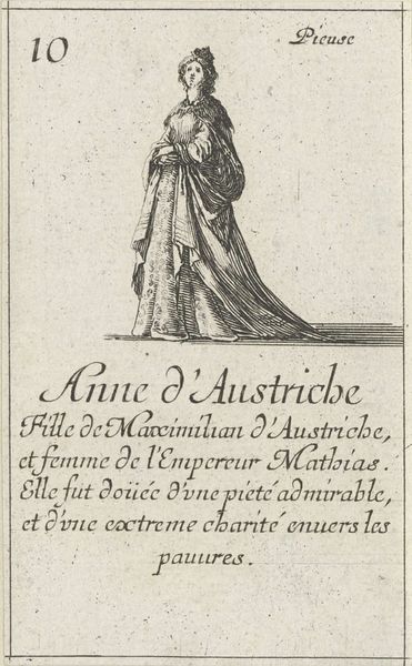 Curator: The image before us, titled "Isabella I de Katholieke," was crafted between 1620 and 1664 by Stefano della Bella and held in the Rijksmuseum. This artwork uses the print medium of engraving. Editor: Its stark monochrome lends it a serious, almost austere quality, doesn’t it? The figure is so carefully rendered, but constrained within this rigid box, these firm, hard lines. Curator: Exactly. The etching would have involved applying a ground to a metal plate, drawing through the ground, and then acid-etching the lines, layering material interventions and decisions at every step. Considering the social context, these prints often circulated among the educated elite. Their ability to produce and interpret them reinforced class distinctions, controlling who saw and benefited from the image. Editor: True, and the crisp lines articulate texture effectively; you can feel the weight of that fabric and almost hear the rustling of the queen’s gown. How the light falls is clearly planned to add a sort of majesty, and how those parallel lines, laid so precisely, build areas of shadow... Curator: Right, the repetitive, almost mechanical act of engraving highlights labor as intrinsic to both process and product. Notice how even the inscribed text serves a decorative as well as informative purpose. The very act of inscribing those words is a labor of dedication. These techniques offered methods of disseminating controlled imagery and narrative tied to empire, and these printed images were commodities produced to solidify power structures. Editor: Looking closely, though, the figure's slightly stiff posture suggests perhaps constraint—within the political system, but even within the very lines that compose her portrait. Is it simply capturing likeness or something more coded, an acknowledgement of limits even within power? Curator: These historical paintings always negotiate a difficult space. The very accessibility afforded through its engraving amplifies its role within society and markets of taste. It speaks volumes about labor, commodity, and circulation and challenges how we see value ascribed to the visual culture of the period. Editor: Interesting perspective. It enriches our understanding of the choices the artist might have been weighing during production. The way those aesthetic considerations were informed by, and simultaneously informed, larger social conditions is a revelation.