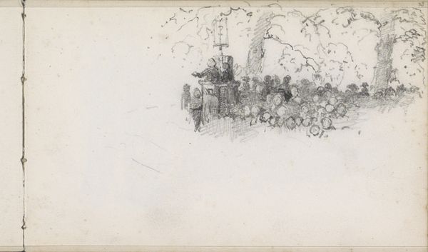 Editor: Here we have Hans Smidth’s "To arbejdsvogne på en vej," which roughly translates to "Two Work Carts on a Road," made sometime between 1870 and 1875 using pencil and coloured pencil. It's currently held at the SMK - Statens Museum for Kunst. The sketch feels sparse, unfinished, even a bit haunting in its simplicity. What strikes you about this piece? Curator: The composition certainly favors a minimalist approach, wouldn't you agree? The reduction of forms to their bare essentials—the suggestion of figures, the skeletal outlines of the carts—invites us to consider the fundamental elements of representation. Editor: Absolutely. The lines are so fragile, barely there. Is the absence of detail a deliberate artistic choice, do you think? Curator: One could argue that it directs our attention to the essence of the subject: the raw, unadorned reality of labour and transport. Notice how the horizontal orientation of the road emphasizes a sense of forward movement, yet the sketch itself seems static, almost frozen in time. What meaning might we glean from this paradox? Editor: Perhaps it speaks to the relentless nature of work, the unending journey? The lack of definition allows the viewer to project their own experiences onto the scene. Curator: Precisely. And what of the relationship between the pencil and coloured pencil? How do these contrasting materials contribute to the overall effect? Editor: The coloured pencil, though subtle, adds a layer of depth and realism, anchoring the sketch in a particular time and place. Whereas without it, the scene might come across more generic. Curator: I agree. The artist invites us to consider not merely what is depicted, but how it is depicted and the intrinsic properties that form meaning. It's fascinating how the simplest of means can convey so much. Editor: This has broadened my appreciation for the piece. I came in seeing an unfinished sketch, but I leave seeing a powerful and carefully considered work.
