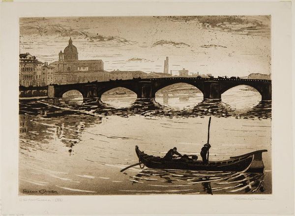 Editor: So, this is "View of the Binnen-Amstel in the Mist" by Willem Witsen, made sometime between 1870 and 1923. It's a pencil, watercolor, and charcoal drawing of a cityscape and the whole scene looks incredibly hazy and serene. It's like looking at a memory. What kind of symbolic weight does a cityscape like this carry for you? Curator: Well, beyond the immediate tranquility, consider how fog often represents the obscuring of memory, or the veiling of truth. The Binnen-Amstel, as a historical artery of Amsterdam, then, becomes a pathway not just through the city, but also through its past. Do you notice how the architectural details, though softened by the mist, still suggest a stoic endurance? Editor: I do. The buildings are still clearly there. Curator: Precisely! It evokes the concept of "genius loci"—the spirit of a place—a spirit that persists despite the mutability of weather and time. And what about the figures crossing the bridge? Aren't they almost ghosts themselves? They are traversing the here and now. Yet, they’re practically indistinguishable from the misty backdrop. Editor: That's a little haunting, but in a gentle way. I hadn't thought about them as being *part* of the mist. It almost makes you feel like the city is swallowing you up. Curator: Perhaps. Or maybe the mist itself is the collective memory of those who have walked that bridge, their stories interwoven with the cityscape. Think about the psychology of place - how our identities become bound up with our environment. Witsen captures that feeling so beautifully. It isn't just Amsterdam, but the *idea* of Amsterdam that’s present. Editor: That makes me think about how our own memories of a place can become more significant than the actual place itself, altered by time and emotions. Thanks, that gives me a lot to think about when I walk across a bridge. Curator: Exactly. Art like this prompts us to examine our connection to places. Hopefully it helps us connect more deeply with where we are and where we've been.
