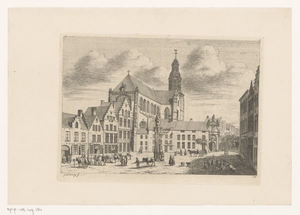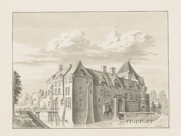 Editor: This engraving, "Stadsgezicht met Kanselarij te Leeuwarden," by Carel Frederik Bendorp, dates from around 1790. It's a cityscape with very detailed architecture. The mood feels calm, almost serene. What kind of stories do you think it tells through its imagery? Curator: It speaks volumes about the civic pride and burgeoning sense of order during the rise of Neoclassicism. Observe how the Chancery, the 'Kanselarij,' dominates the scene; it’s a temple of governance, meticulously rendered to inspire confidence. Consider the choice of engraving itself - a medium lending itself to precise reproduction, disseminating ideals of reason and enlightened rule throughout society. Editor: I notice people in the foreground, almost like genre painting within the cityscape. Is there anything we can interpret from that? Curator: Precisely! The figures, seemingly incidental, subtly reinforce the new social order. What kind of message do you believe these ordinary citizens might convey? Their activities, balanced between work and leisure, point towards a well-regulated society enjoying the fruits of its progress. The figures near the water and on the bridge, can be interpreted as engagement with civil life through travel, trade, and lawmaking. The people near the front walking dogs evoke privilege. Do you feel this idyllic imagery portrays an authentic sense of 18th-century Dutch society, or more of a symbolic representation? Editor: I see your point. I think there is some romanticization happening in this image. Maybe there are even a few symbols that escape me? Curator: Consider how the architectural setting might signify authority, but the soft treatment of nature and citizenry introduces harmony. That juxtaposition itself is ripe for discussion. Editor: That's fascinating! I will be looking closer to architectural symbols from now on! Curator: Indeed, artistic depictions provide insights on values!