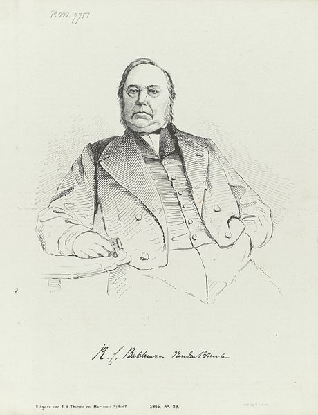 Curator: Looking at this portrait, I immediately sense a profound pensiveness. There's a weighty introspection conveyed, don't you think? Editor: Indeed. This is "Portret van Nicolaas Beets," made between 1850 and 1886. Dirk Jurriaan Sluyter rendered it, employing graphite and etching. It is currently housed at the Rijksmuseum. What resonates is how this image circulates power, not simply an image of the man, but the status conferred on intellectuals in Dutch society at the time. Curator: Power is a key element here. It's not just an individual portrait; it represents the social and cultural power vested in figures like Nicolaas Beets. You feel the intersectionality of class, status and identity coming into play. Editor: Precisely. Consider how institutions validated and cemented these notions of leadership, culturally and politically. The museums acquire it. Publishers create images. Etchings were a mass media and this image circulated widely to show what an ideal of leadership looks like. The image doesn’t just *show* Beet’s status, it *creates* his status. Curator: How can we apply that context? To what extent was he actively complicit? Was he benefitting from historical power structures to ensure the power dynamics remained intact? Editor: Sluyter creates a very controlled composition. Nicolaas Beet’s gaze is direct, his arms crossed...He takes up a lot of space on the image. The detailing, particularly the light and shadow around his face, further accentuates this serious mood. It’s a portrait that makes sure the audience recognizes his seriousness of mind. Curator: The pose and the meticulous technique are interesting. It’s about controlling public perception, something very relevant still today, when representation shapes our understanding. Who decides what's portrayed and who does the portraying and the consequences of it? Editor: Well, that's the beauty and challenge in analyzing these historical images. It prompts these difficult yet crucial questions about visibility, about cultural authority, and the ever-shifting dynamics between artist, subject, and society. Curator: It underlines how much a portrait encapsulates history, not merely the individual, but also societal frameworks that constructed identity. Editor: Exactly. These aren’t just images from a long time ago. Images like these tell a wider and far reaching narrative of how a social construct of an individual becomes reality.