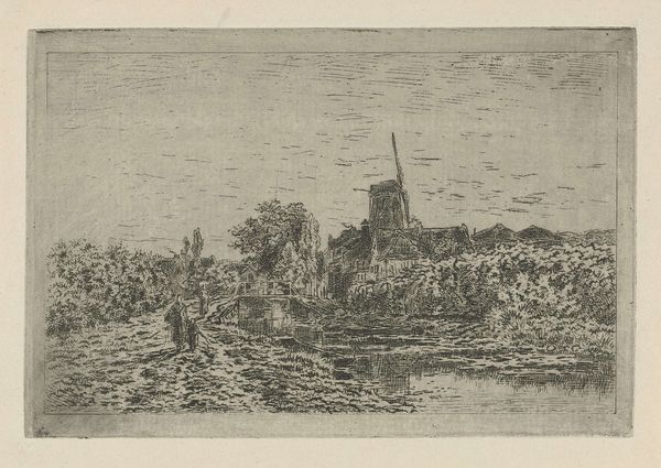 Curator: This monochrome etching, "Landschap met een koe," or "Landscape with a Cow," comes to us from an anonymous artist, created sometime between 1630 and 1700. It's currently held at the Rijksmuseum. What strikes you initially about this scene? Editor: There's an immediate sense of openness. Despite the small scale of the etching, the artist conveys vastness. I’m also struck by the contrast. The foreground feels heavily worked with darker lines and figures, fading to a lighter, almost dreamlike, distant landscape. Curator: The technique certainly reinforces the effect of depth and distance, doesn't it? And yet, there's also a deliberate flattening, perhaps typical of the Dutch Golden Age approach to landscape, presenting an almost symbolic order onto nature. Consider, for instance, the way figures populate the planes. Editor: That tension is precisely what grabs me! The people, rendered in varying degrees of detail, point to socio-economic realities, rural life marked by labor and leisure. That lone figure walking towards us could be seen as embodying labor, walking from one realm into another, with the seated individuals almost representing land ownership and an entirely different set of freedoms, maybe. Curator: It is a lovely intersection of daily life and timeless landscape. Speaking of timeless, notice how certain forms—a rudimentary structure of some kind, a gathering of figures—repeat like motifs in much earlier landscapes; in, for example, early printed books or even medieval tapestries. The simple act of seeing and etching a cow holds within it layers of meaning carried through the centuries. It anchors us in an unfolding visual lineage. Editor: Yes, and thinking of cows within landscapes during this period is interesting. There is, after all, a reason that landscape and pastoral imagery enjoyed popularity at that moment in history. The rise of trade and merchant wealth meant that land and its yield were deeply connected to nascent Dutch identity formation. It could almost be a propagandistic piece in that respect, one that ties the national image with an image of agrarian plenty. Curator: Precisely! We look at it now and see a "simple landscape," but it resonated powerfully in its time. It provided an image that the emerging, self-fashioned nation could celebrate and hold onto. The landscape in itself becomes an enduring icon. Editor: Absolutely. Thinking about this further contextualizes our present moment, showing how art continues to inform national identity and values. It has been a fascinating examination!