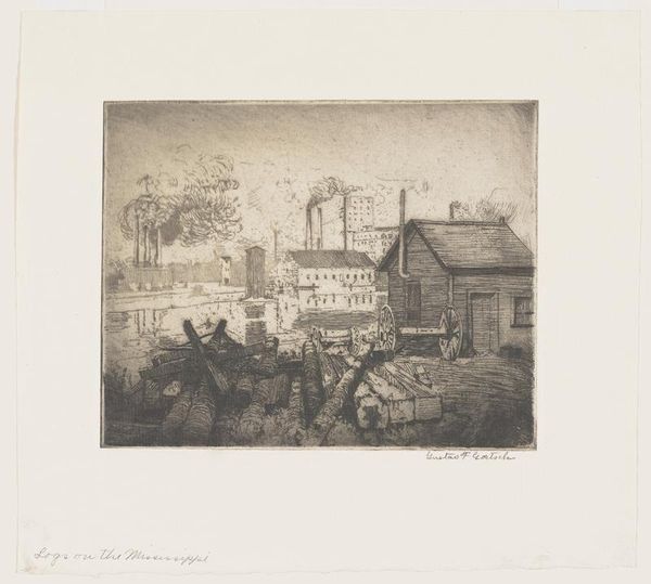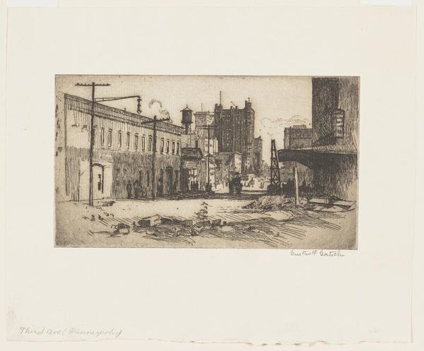 Editor: Here we have Gustav Goetsch’s "The Milling District," likely created in the early 20th century. It's an etching, so a printmaking technique. The overall mood is quite industrial, even somber. What strikes you about this cityscape? Curator: Well, considering this print’s probable date, it’s vital to address the implied labor that makes possible this built environment depicted. This isn’t just an aesthetic rendering of architecture. Goetsch's decision to create an etching, a readily reproducible medium, points towards a broader circulation of this imagery, beyond an elite art market. Editor: So, the medium itself is important. Why etching, and why depict something like a milling district? Curator: Etchings, with their detailed lines and tonal range, offered artists a relatively inexpensive and accessible medium for portraying modern life. Depicting a "milling district" shifts the artistic gaze from traditional landscapes to the industrial engine of a city. We can see here a perspective from consumption that focuses on process, which calls attention to the materiality of our culture and everyday products. Editor: Interesting. It's not just a picture of buildings, it's about how things were made. Curator: Exactly. We should consider whose labor went into building those structures, operating the mills, and transporting the raw materials. Furthermore, we should think about the resources consumed, the waste generated, and the environmental impact of such a concentrated industrial zone. Editor: I see the puffing smoke and chimneys differently now, not just a generic landscape element, but as something more significant! I also now better grasp the class commentary that the use of the medium implies in pieces like these. Curator: Indeed. These images reflect, and participate in, material realities. Thank you for this interesting insight!