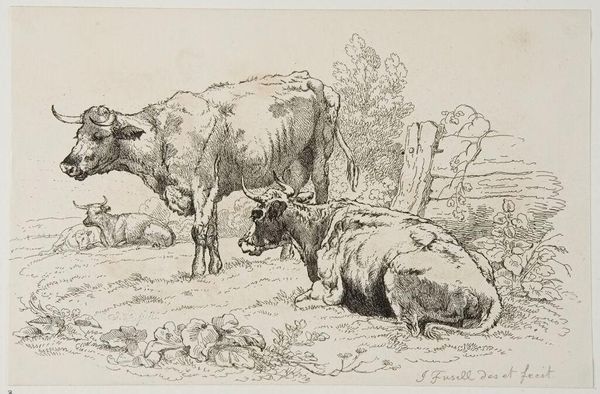 Editor: This is Plate LX by Jacques-Francois-Joseph Swebach, currently held at the Harvard Art Museums. It has a relaxed, almost pastoral feel. What strikes me is how the figures and animals seem paused, taking respite from a journey. How do you interpret this scene? Curator: It’s interesting you call it pastoral. While seemingly serene, these kinds of images often romanticized military life and the role of horses in warfare. Consider the social context: how did such prints shape public perception of military campaigns and power? Editor: So, the calm feeling might be a carefully constructed image? A way to make war seem less brutal? Curator: Precisely. The print invites us to consider the intended audience and how imagery served political purposes in its time. What do you make of the architecture in the background? Editor: I hadn't considered that. Now, I see a staged tableau, almost propaganda. Thanks, I have a lot to think about. Curator: Indeed, art always reflects its time.