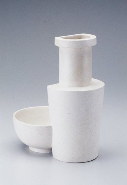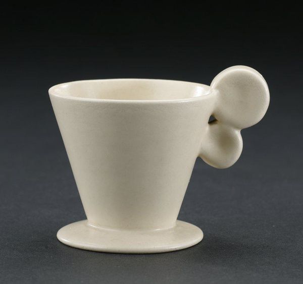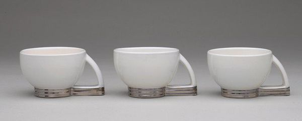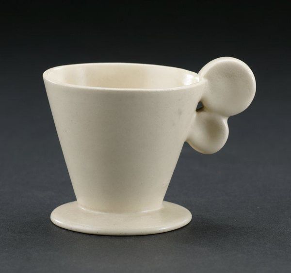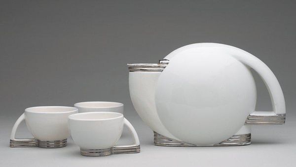 Curator: As we examine this Art Deco-era tea service, attributed to Margarete Heymann-Marks Lӧbenstein around 1930 and held in the Minneapolis Institute of Art collection, consider its elegant design and functional appeal. It’s made of ceramic. Editor: My first thought is that it looks incredibly… playful. Almost like a child’s toy tea set blown up to adult size. The geometric forms are softened by those whimsical, spherical handles. Curator: Yes, the contrast between the severe geometry, classic of Art Deco, and those almost cartoonish spherical handles, is very striking. These choices likely speak to a desire for lightheartedness amidst the anxieties of the interwar period. Do they perhaps invoke images of modernity and optimism? Editor: It’s definitely playing with that tension. The color contributes to the narrative, doesn't it? The monochromatic glaze flattens the shapes, heightening their abstract qualities, it brings up some intriguing semiotic interplay between form and function, a modernist ideal perhaps, but in an unexpected way. Curator: Certainly. Tea rituals are historically a social act; might we read this design as a response to changing social customs? Perhaps a gentle subversion of formality by way of playfulness? Tea and ceremony might be evolving! Editor: And there is something to the sheer materiality that really adds to my appreciation. It's cool. And precise in line and shape. And the smooth, unbroken glaze feels inviting, despite those strong angles, the monochrome look adds depth to the shadows around those beautiful, big circles on the sides. Curator: Observing the design elements like these is insightful when we discuss this teapot and its symbolism as a statement about design itself. Editor: Yes, I would have to say after giving it my attention, this tea set’s delightful blend of severity and playfulness leaves a lasting impression. Curator: I agree. It provokes considerations of shifts in the aesthetics and conventions during this period.