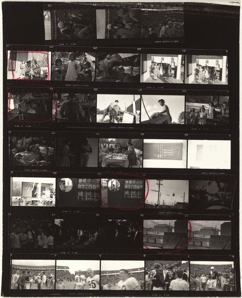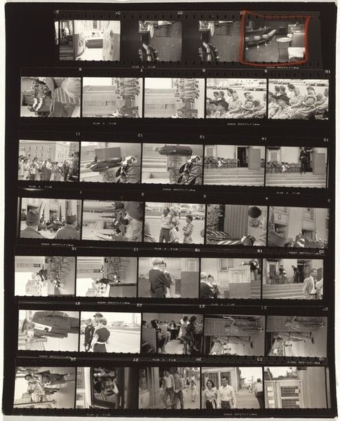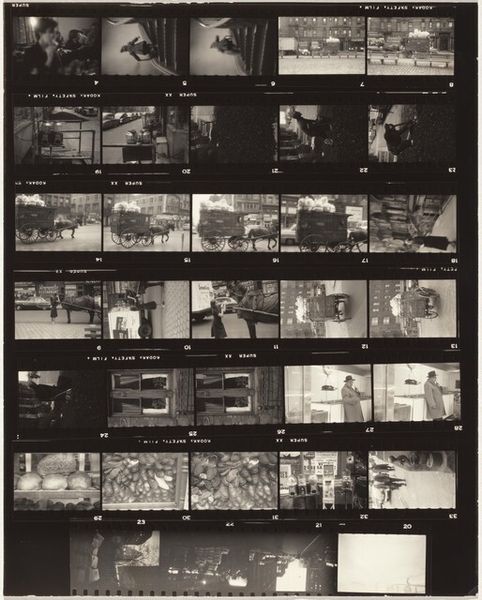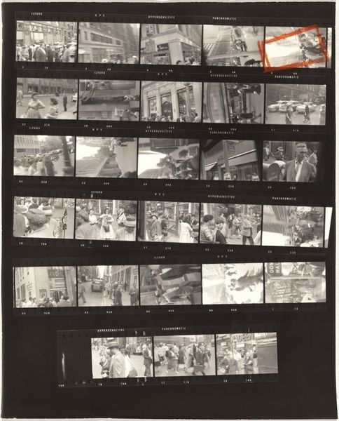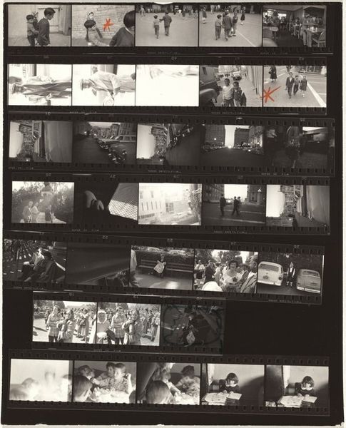 Curator: Robert Frank's "Switzerland--Paris 1," created in 1959, presents a contact sheet brimming with moments, captured on film, offering a fragmented glimpse into life. Editor: It’s stark. The high contrast and grainy texture of the film create a mood that feels both immediate and distant, like looking through memories not quite your own. Curator: Absolutely. The nature of the contact sheet itself emphasizes process, each frame a single, tangible moment within the wider roll. It pushes the discourse beyond a single 'perfect' shot into how meaning is actually generated. The edges are torn, too—a rather physical act, emphasizing its objecthood. Editor: This rawness contributes, I think, to a sense of disruption that was present in the post-war period. There is an overall sense of anxiety of a generation coming to terms with modernity, right? Frank captured the zeitgeist in America too, especially through his focus on social fragmentation. Seeing those visual themes mirrored here—with this disjunctive series of views— resonates profoundly. Curator: Precisely, consider how his use of the 35mm camera helped shift photography toward that which celebrated spontaneous capturing over calculated compositions, right? Look at the manufacturing codes around the photo themselves: DuPont Safety Film. It pushes our recognition of photography as a commodified, accessible form, instead of only seeing the artist and their subjects. Editor: And yet, within the grittiness of the film grain, a strange intimacy emerges from this contact sheet, where we get a fly-on-the-wall glimpse into all strata. How those stories interplay on a global scale, given Frank’s focus outside the U.S. borders, is really something special. Curator: Ultimately, it is that interplay between the materiality of the photograph and the political charge that gives "Switzerland--Paris 1" its unique impact, a stark but essential document. Editor: It is definitely a work to return to, layers continuing to surface each time, each view exposing new dimensions to the past.