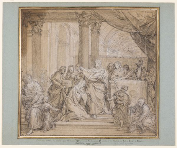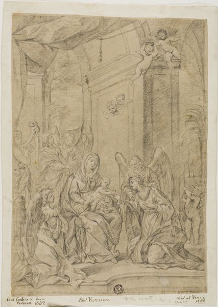 Editor: Right, so this drawing, "Allegory of the Death of a Religious Man," is by Frans Francken the Younger, made sometime between 1601 and 1642. It's an ink and watercolor piece on paper. It feels incredibly intimate, even with so many figures crammed in. I'm particularly struck by the swirling cloudscape at the top… almost like the ceiling of reality is opening up. What jumps out at you when you look at it? Curator: Oh, "ceiling of reality opening up"… I love that. To me, it’s a masterclass in controlled chaos, really. Think about it – you have the earthly scene of mourning, all contained and framed within the room. But above, that heavenly vision is all movement and light, breaching the composition, literally! Francken’s clever juxtaposition whispers of the Baroque era’s obsession with the spectacle of the divine intervening in human affairs, a drama playing out in sepia tones. The etching-like detail suggests the ephemeral quality of life itself, wouldn't you agree? Editor: I see what you mean about the contrast creating a drama. Do you think he meant for it to be comforting or unsettling? Curator: A bit of both, I suspect! Francken offers us the balm of spiritual ascension to soothe the sting of mortality. The swirling clouds… it’s like looking into the infinite. Are you finding that hopeful, even now? Editor: I am, actually. I hadn't considered the 'hopeful' element at first. It is growing on me. Curator: Precisely! Baroque art often wants to sweep you away on a tide of emotion, and what bigger emotion is there than our collective fear, or hope, around death? Editor: This has completely altered my understanding of it, that even with an obvious theme like the death of a religious man, an artist has freedom to make it intimate. Curator: Yes, and hopefully the artist inspires us all to re-think what is known!