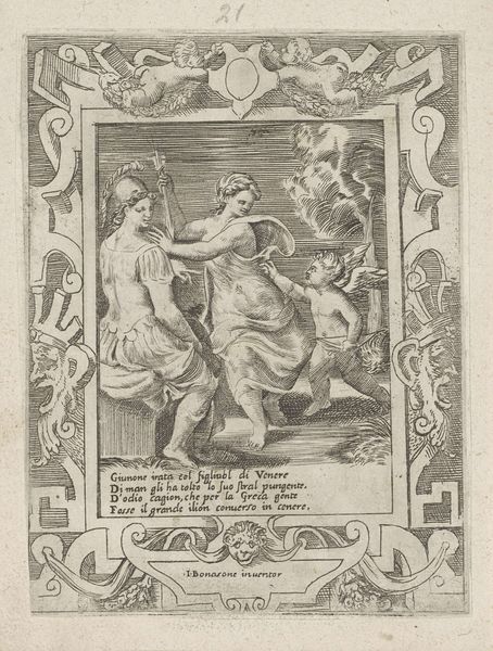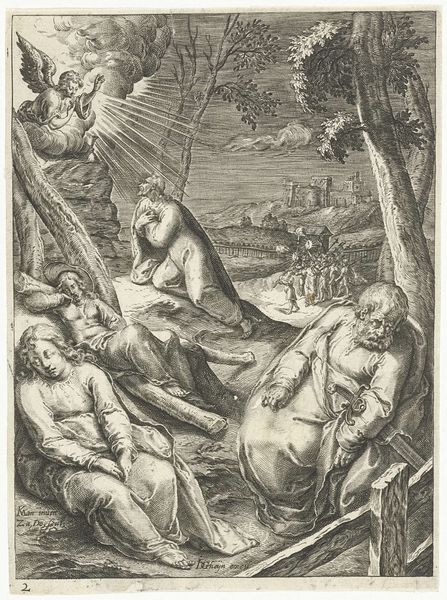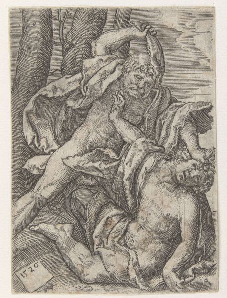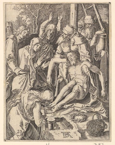 Curator: Agostino Carracci gifted us "Corpus Christi" in 1581, a detailed intaglio print currently residing here at the Rijksmuseum. Editor: It strikes me as raw, visceral almost. The hatching creates so much depth, a kind of chiaroscuro effect in monochrome. Curator: Absolutely, the artist’s masterful use of line is central. Consider the figures’ muscularity, the anatomical precision captured with simple strokes. You almost feel the weight and strain. Editor: The Mannerist influence is evident in those elongated forms and the somewhat theatrical presentation, but do you find it distracts from the piece? Curator: Not at all. The drama amplifies the message. The inscription "Mors mea vita tua" hints at sacrifice, suggesting profound empathy from Agostino. I mean what's more intimate than suggesting someone elses life rests on the shoulders of your own death? Editor: True. The composition directs your eye immediately to the older figure supported by the others. Curator: Precisely. Those supporting figures almost cradle him, but with tense effort. There’s struggle in their assistance. It makes me wonder about Agostino's life as well - his art. He probably felt torn like this, and just translated that into his art? Editor: An interesting proposition. Considering his stylistic trajectory within the broader Mannerist context. The balance is, again, interesting—a play between visual harmony and almost disorienting exaggeration. Curator: So ultimately this intaglio holds more than just its historical and artistic context. For me, it’s a reflection on the burdens and interconnectedness of life and that maybe the struggles of your own are the making of yourself and those around you. Editor: And I'll say this: through lines alone, Carracci reveals the complex tensions and profound elegance inherent within art and sacrifice. I might need a new understanding on Italian Mannerism...