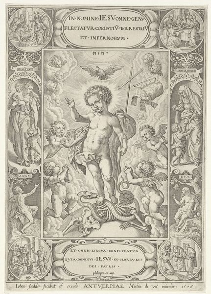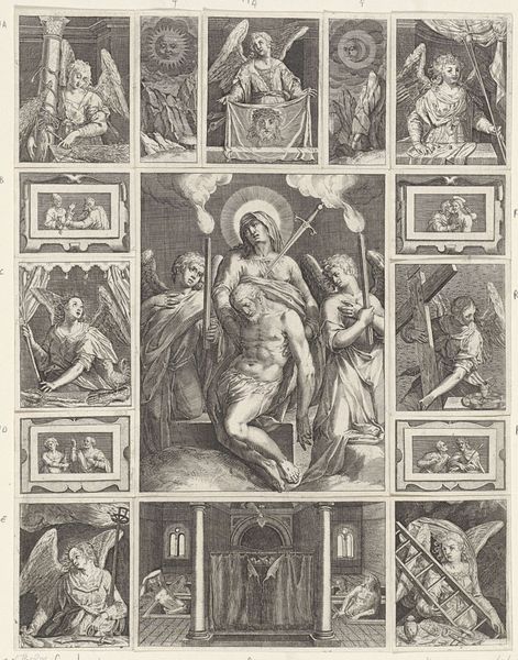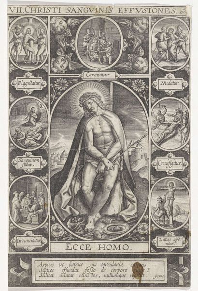 Curator: This engraving by Johann Sadeler I, created between 1582 and 1597, is titled "Christus en de werken van barmhartigheid," which translates to "Christ and the Works of Mercy." It’s currently held at the Rijksmuseum. Editor: It’s quite striking. The detail achieved with simple lines is impressive. The composition is intricate; I’m immediately drawn to Christ in the center, but then my eye is led around the circular vignettes surrounding him. Curator: Indeed, Sadeler presents a powerful visualization of charitable acts. He was working during a period of significant religious and social upheaval, when the role of good works in achieving salvation was heavily debated. Prints like this played a vital role in propagating and reinforcing certain beliefs. Editor: Look how deliberately he structures each scene within those circles. The contrast between light and shadow emphasizes the volume of the figures. And each story seems self-contained yet united with a common theme through a complex design and symbolism. Curator: Precisely. Consider how Sadeler employs a visual hierarchy. Christ is centrally positioned and larger, underscoring his importance. Surrounding him are scenes depicting the traditional works of mercy: feeding the hungry, clothing the naked, visiting the sick, and so forth. The composition reinforces the idea that Christ is the embodiment of these actions. Furthermore, its likely that it was commissioned to display or confirm the wealth, status, piety, and virtue of the patrons, Joachim and Otto Henri Comte de Schwartzenberg. Editor: It is worth pondering the way Sadeler rendered Christ. He does so with very precise lines defining form. Also his halo of light creates focus around him to capture our eye. Curator: Reflecting on the era's emphasis on religious education through art, the engraving encourages viewers to contemplate their own moral responsibilities. The deliberate inclusion of scriptural texts further reinforces its didactic function. Editor: It is thought-provoking how this meticulously crafted artwork manages to convey both theological arguments and practical guidance within a visually appealing frame. Curator: Absolutely. This artwork acts as both a reflection of its era's spiritual concerns and the social function of its elite members. Editor: An amazing piece from a design and representational aspect as well.