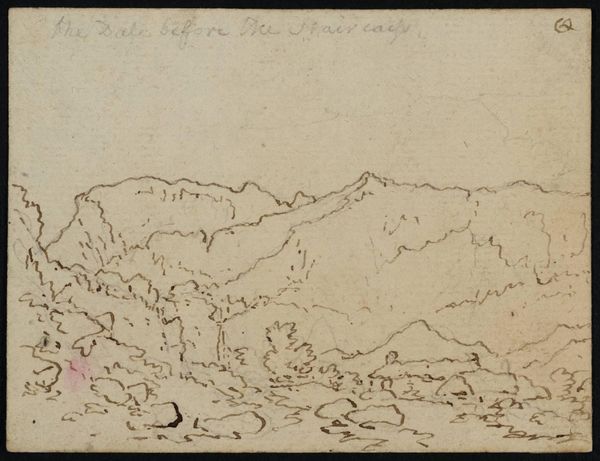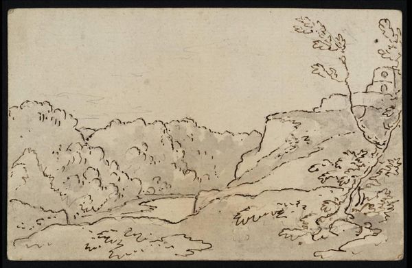 Editor: Here we have Philip James De Loutherbourg’s “View of Woods and Hills across the Avon Gorge at Clifton,” from the Tate Collections. It's a delicate ink drawing. What strikes me is the way he captures the vastness of the landscape with such minimal detail. What do you see in this piece? Curator: I see a negotiation of power. The "picturesque" landscapes were often commissioned and consumed by the wealthy, reinforcing their dominion over land and resources. De Loutherbourg, by focusing on the wildness, hints at a critique. Do you think he's celebrating the sublime, or questioning who gets to access and define that experience? Editor: I hadn't considered that angle. It is thought-provoking, I was so focused on the aesthetic appeal. Curator: Right, and that tension – the beautiful versus the political – is precisely where the artwork sparks dialogue. Editor: This gives me a lot to think about concerning landscape art and its cultural implications. Thanks!