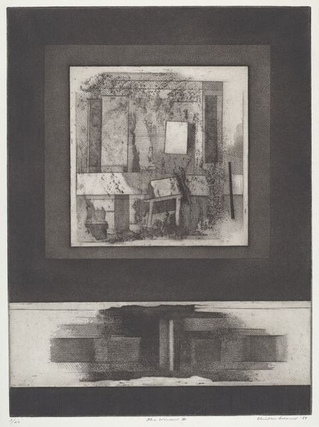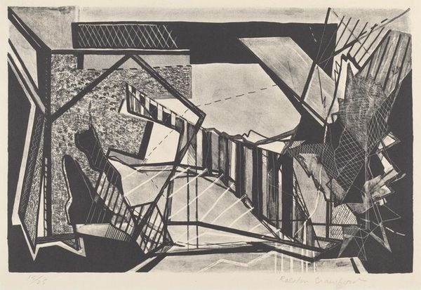 Curator: Here we have Bernard Greenwald's etching from 1965, titled "Room". It's a fascinating example of the artist engaging with modernist abstraction through printmaking. Editor: It feels… unsettled. The geometry is present but chaotic; the varying tones created by the etching feel more anxious than organized. Curator: That tension might be intentional. Greenwald created this during a period of significant social upheaval. The work's cubist leanings allow for a fractured perspective, a reflection perhaps, of the fragmented sense of reality prevalent during the Cold War era. The room, normally a place of refuge, seems almost hostile. Editor: I agree. Looking at the composition, I see a fascinating interplay of positive and negative space. The heavy lines create strong geometric shapes, but the emptiness within these shapes is equally powerful. I'm particularly drawn to the circle near the top; it is the sole curved line in a network of rectilinear lines, a break in the established grid. Curator: And consider how the artist's choice of printmaking impacts the piece's reception. The inherent reproducibility of print allows the image to disseminate, becoming more accessible and embedding itself within the broader cultural landscape. Greenwald used etching, but why this medium and not lithography or screenprint? It adds layers of historical depth and symbolism. Editor: The use of etching gives this “Room” its distressed beauty. The textures created from the etching process give a hand-made effect, emphasizing that we are, in fact, observing an architectural abstraction, with linear perspectives flattened into planes. Note the visual weight that shifts across the surface due to tone differences; light struggles for purchase within the geometric network of dark line and shadowed shapes. Curator: Absolutely, and Greenwald’s focus on form—pure geometric form—isolates these architectural signifiers from function. Stripped of their intended purpose, what remains is the disquieting aura of a built environment divorced from human comfort or intent. It challenges the role of architecture as both physical shelter and ideological framework. Editor: It is an impressive print that makes one think, not only about geometry, but also about negative space and mark making; what constitutes a constructed reality? Curator: The artist made the room a vessel for ideas and questions, very telling. Editor: I appreciate you providing socio-cultural contexts, it gives greater depths to my formal assessment of lines and composition.