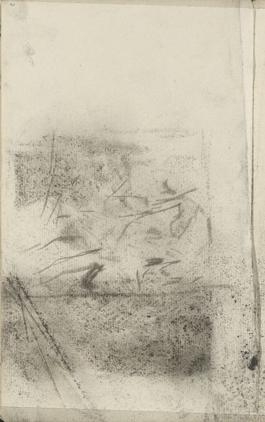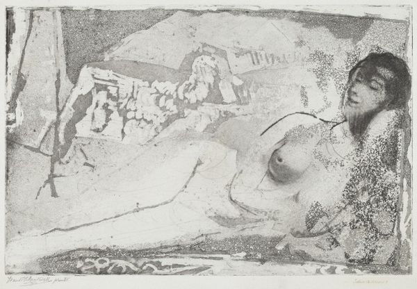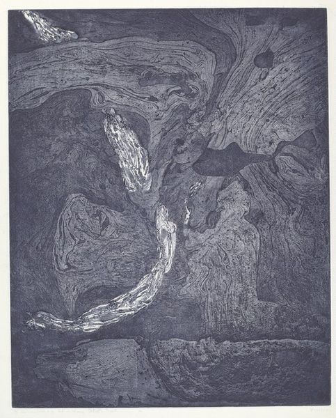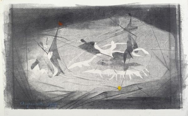 Editor: Here we have Adja Yunkers' "Desert," a 1949 graphite print. It's almost entirely in grayscale, a complex layering of tones that gives the impression of… fossilization, maybe? All these intertwined forms create an image that reads almost like a buried memory. What jumps out at you? Curator: Notice the artist's strategic application of graphite, resulting in varied textures and tonal ranges. See how Yunkers articulates form not through explicit outlines, but through contrasts in value. The interplay between light and shadow creates spatial ambiguities that both reveal and conceal, inviting closer inspection of compositional balance and the use of positive and negative space to engage with our perception. Observe the textured layering of shapes against stark geometric interventions that invite both visual interest and interpretation. Is the single spot of red in this grayscale field an intentional disruption, perhaps drawing the eye towards a deeper level of symbolic resonance, or is it strictly a formal compositional tactic? Editor: The interruption makes the composition very active, setting up different spatial relationships with that single spot of red. The layering does make it feel as though one element informs another… but why the desert? Curator: What if the ‘desert’ of the title refers not to a literal landscape but to the sparseness, a reduction of form to its essential components? Consider, too, the formal qualities, the textural interplay and stark lines which constitute the artist’s expressive vocabulary. Doesn’t the stark monochrome palette intensify this sense of reduction, compelling us to appreciate the intrinsic qualities of line and form? Editor: I see. By emphasizing the visual elements, he prompts us to deconstruct the image and reconstruct it, unearthing the ‘desert’s’ deeper compositional intent. It definitely challenges the viewer to look beyond the immediate impression. Curator: Precisely, and it allows us to look at all landscapes—and abstractions—with greater discernment of fundamental forms and relationships.
