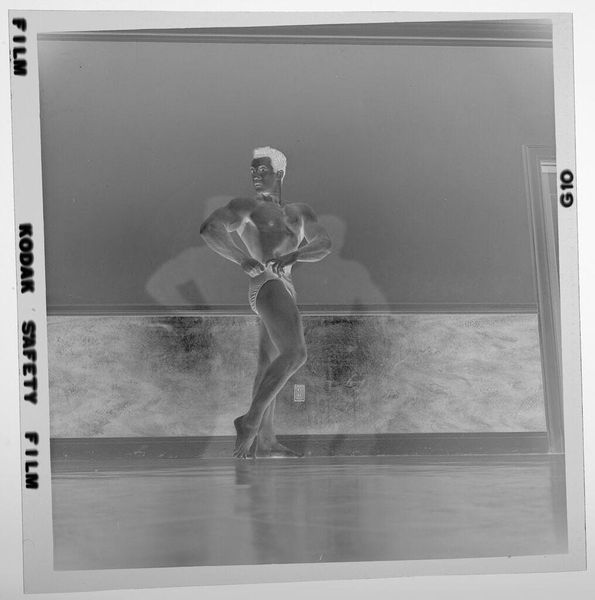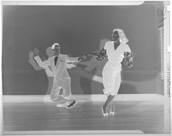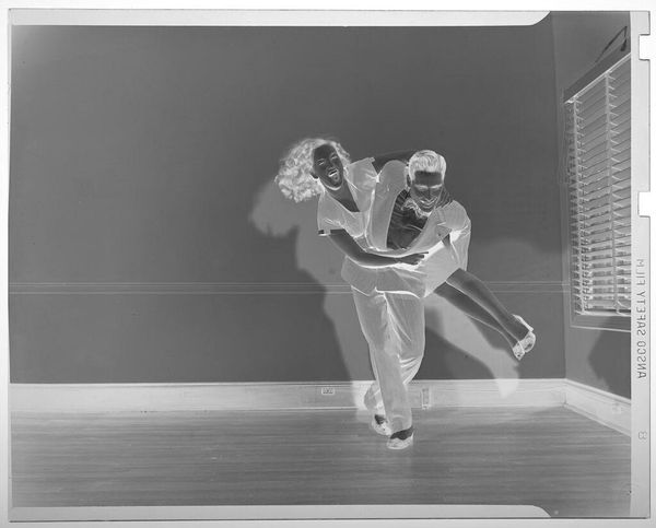 Editor: Here we have an untitled photograph by Jack Gould depicting a couple dancing the jitterbug. It's a small work, about 4x5 inches, and the composition is striking. What do you make of its visual language? Curator: The inverted tones are indeed compelling, shifting our perception from representational to abstract. Note how the stark contrast creates dynamic contours, emphasizing the couple's kinetic energy. How does this inversion affect your understanding of the dance itself? Editor: It almost makes it feel like a ghostly memory, a fleeting moment captured. Does the lack of tonal depth detract from or enhance the visual impact, in your opinion? Curator: It pushes us to focus on form and shape, the very essence of their movement. The flatness amplifies the geometry of their bodies and their relationship. What elements within this formal arrangement catch your eye? Editor: I see the way their bodies mirror each other, the bend of their knees, the tilt of their heads. It's all very balanced. Thank you for helping me see this in a new light. Curator: You're welcome. Focusing on formal relationships can unlock rich interpretative possibilities in any artwork.