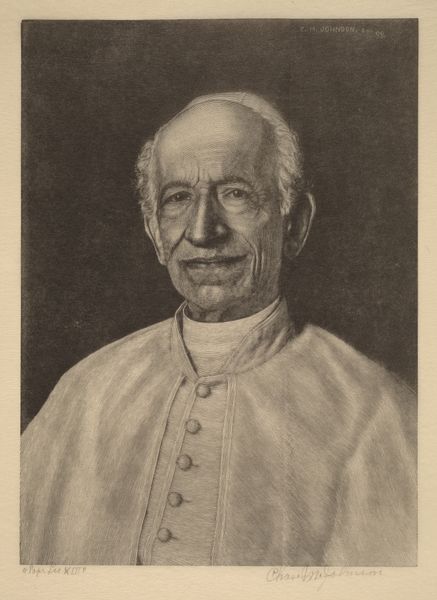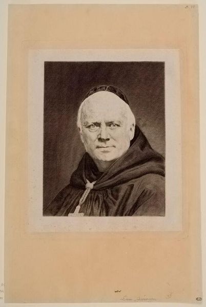 Editor: So, here we have a gelatin-silver print from around the 1860s to 1880s. It’s a reproduction of what’s believed to be a drawing of Pope Pius IX. I'm struck by how this image, though photographic, seems to harken back to older, more idealized depictions of religious figures, but maybe with a hint of… caricature? What do you make of it? Curator: I see a layering of symbolism, a palimpsest of power. The photograph, as a reproduction, inherently speaks to the dissemination of the Pope’s image, and with that, his influence. Note the rosary beads in his hand; a potent emblem. But what feeling does the *act* of reproduction invoke in you? Editor: Well, it does make it feel slightly detached from the original, a step removed from reality. Does the style - being based on a drawing, not an original photo, give the image extra cultural weight or does it somehow dilute the message? Curator: The style acts as a deliberate invocation of tradition, think of the Papal portraits spanning centuries, each contributing to a collective understanding of authority. This photograph attempts to tap into that reservoir, reinforcing the established perception. But even in doing so, it participates in a changing visual landscape. How do you interpret that slight smile playing on his lips? Editor: I guess it gives him a sense of approachability that you don't normally see in official portraits. It's like they're trying to soften the image while maintaining that authority. Curator: Precisely. The artist grapples with tradition and the nascent power of photography, revealing anxieties and aspirations. The photograph reveals the cultural memory and, I suppose, future continuities of the Church. Editor: I didn’t think about the push and pull between those two, the tradition and the photographic medium itself. Thanks for the insight. Curator: It's a fascinating conversation – every detail a potential thread leading to understanding the period's complex relationship to power and faith.