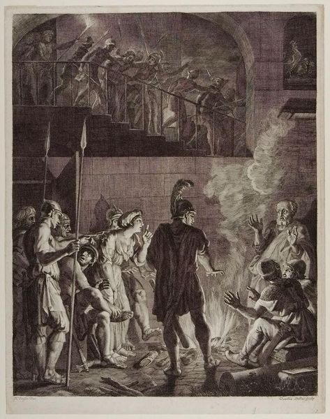 C.A. Lorentzen made this oil on canvas painting titled 'Den Vægelsindede, II akt, 16. scene' which translates to 'The Vacillating, Act II, Scene 16' sometime before his death in 1828. The way this painting is crafted, with its muted tones and visible brushstrokes, it almost feels like looking at a stage set itself. Oil paint allows for layering and blending, creating depth and atmosphere, which Lorentzen uses to great effect here. The scene is from a play, and the way he uses light and shadow really brings out the drama. Look at how the figures are arranged, almost like actors on a stage, caught in a moment of surprise. You can almost hear the music and laughter, feel the chill of the night air. Paintings like this were luxury items back then, bought by wealthy patrons to show off their refined taste. But it also gives us a glimpse into the popular entertainment of the time, the kind of plays people enjoyed. The canvas and pigments, the artist's labor, the patron's wealth—it all comes together to tell a story, not just on the canvas, but about the society that produced it.
