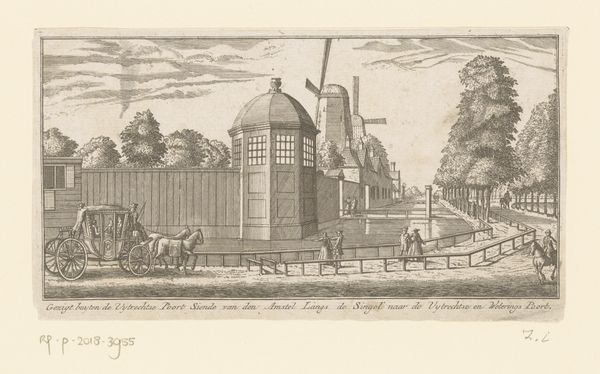 Curator: Here we have Hendrik de Winter's "De IJsselpoort te Oudewater," created around 1746, rendered with ink and etching techniques. Editor: Immediately, the drawing evokes a feeling of calm, doesn't it? The monochrome palette lends a timeless quality. The way the light filters across the gate is striking. Curator: De Winter's cityscapes are intriguing because they're not mere topographic records. Consider the choice of viewpoint: he situates us just outside the city gate, subtly mediating our access. The Ijsel Gate itself represents the political and economic power of Oudewater at this time. City gates like these controlled the flow of goods and people. Editor: And people are right there, on that little bridge, strolling back and forth in full daylight, but somehow, everything still looks like an escape. There’s something inherently exclusionary in a city gate. How did the artist negotiate that divide between inside and out, especially through the positioning of these small, pedestrian figures? What can we say about this moment when people of a small community seem to cross lines? Curator: Oudewater held strategic importance, located on the Holland-Utrecht border, giving it significance in regional conflicts and trade. The Ijsel Gate symbolizes its autonomy. But De Winter doesn’t depict dramatic events; his intent isn't to portray warfare. Rather, it is the peace and quiet order of a functioning civic space. Editor: But consider this serene image produced at a time rife with political maneuvering and anxieties of expanding empires, colonialism, or the slave trade, things always out there. We may need to accept the paradox: images like these simultaneously reinforce order, while the other narrative continues. De Winter is depicting a specific place but does he invite to consider a broader spectrum of reality. Curator: Perhaps it serves as a kind of utopian vision of the Dutch Republic, reflecting stability and civic pride. These depictions also boosted civic identities. Editor: It makes one think about who got to participate in the "civic" life being represented and celebrated here and whose experience may be silenced, erased, or unseen in these "calm" imageries. I can imagine a darker underbelly when I watch art of that era. Curator: I'll definitely look differently the next time! Editor: Indeed, understanding what these images obscure alongside what they reveal is crucial.