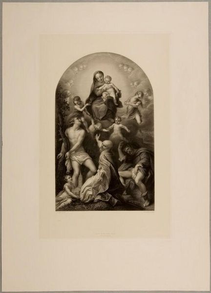 Editor: So this is "The Immaculate Conception" by Achille Désiré Lefèvre. There's a real softness to it, almost dreamlike with all the cherubs. It's quite serene. What do you make of its message, beyond the obvious religious aspect? Curator: Serene is a good word! For me, it’s about more than just religious iconography. It's about the idealized feminine form, the aspiration to purity and grace. Look how Lefèvre uses light; it's practically sculpting the figure, wouldn't you say? Editor: Absolutely, the light almost lifts her off the page! I guess I was so focused on the cherubs I didn’t see how powerfully she's rendered. Curator: Exactly! It's a celebration of idealized womanhood. Reflect on that... light and form, a symphony of grace.