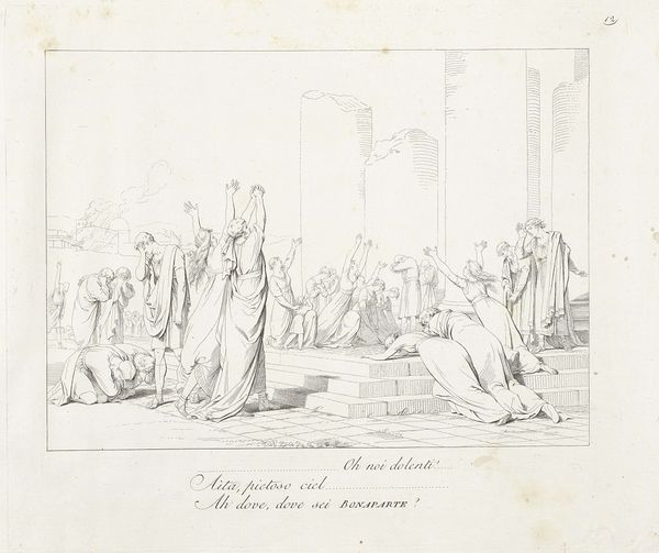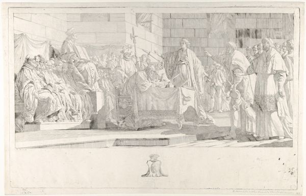 Teodoro Matteini made this print depicting a crowd offering Napoleon a laurel wreath. The image is an exercise in the politics of imagery. It evokes classical Rome to glorify Napoleon's imperial ambitions. Created sometime around the turn of the nineteenth century, this Neoclassical style aligns with Napoleon's conscious adoption of Roman symbols. Note the architecture in the background, the togas, and the laurel wreath itself – all visual codes designed to legitimize his power by associating it with the grandeur of the Roman Empire. This wasn't just about aesthetics; it was about crafting a narrative of continuity and authority. The print also reflects the institutional context of art production at the time. Artists were often commissioned to create works that served a clear propaganda function, reinforcing Napoleon's image as a divinely appointed ruler. Historical records, including letters, diaries, and official documents, would help reveal the extent to which art served as a tool for shaping public opinion during this period.