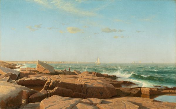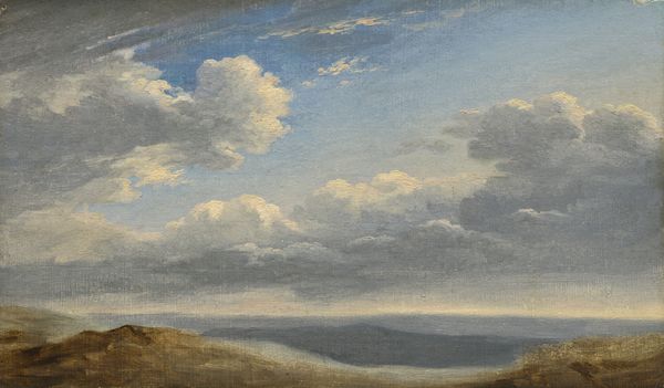 Curator: Anders Christian Lunde offers us "Strandparti i nærheden af Tårbæk," or "Beach Scene Near Tårbæk," believed to have been created between 1824 and 1886. The artist employed oil paint on canvas to capture this landscape. Editor: My immediate reaction is one of tranquil observation. There’s a certain luminescence in the sky that casts a golden glow upon the sandy bluff. Curator: Indeed. Lunde’s masterful manipulation of light and shadow is readily apparent. Observe the meticulous rendering of the clouds. Notice, as well, how the composition adheres to classical principles, grounding us in a sense of balanced space between land, sea, and sky. Editor: Absolutely, and if we consider the context of plein-air painting at the time, what could seem to be simply representing a Danish coastal area transcends this straightforward realism? Are we sure, for instance, of what activities might have filled the lives of people who lived along this beach at that time? Who are the passengers on that boat? I wonder what realities are missing here, too. Curator: A valid point. Yet it is essential to appreciate Lunde's formal accomplishment. He deploys visible brushstrokes to give texture, and his atmospheric perspective provides considerable depth, even though the overall mood appears unassuming. Editor: But isn’t that mood complicit? By offering us the surface pleasures of leisure without showing laborers or struggles, is he not giving his viewers an image free of disruption or contest? I think about gender, too—the ways that spaces have different connotations depending on who occupies them, what they mean for one person as opposed to another. The artist may also invite scrutiny concerning their social perspectives. Curator: It appears Lunde endeavored to represent the shoreline as accurately as possible; still, I believe his approach may lack complete verisimilitude regarding the lives and communities present during that period along the Tårbæk. It might lead us to inquire how our modern expectations might impact our appreciation. Editor: Precisely! Thank you for helping explore all angles! Curator: You have been heard and understood, indeed!
