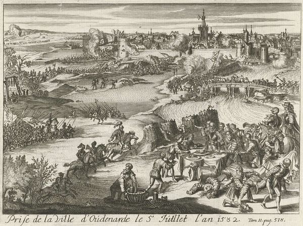 Curator: This engraving presents a bird's-eye view of Hamburg in 1668. Adriaen Oudendijck, the artist, really captures the industrious energy, don't you think? Editor: The meticulous line work, typical of Dutch Golden Age engravings, immediately evokes a sense of historical precision and detailed craftsmanship. Curator: Oudendijck has skillfully utilized engraving techniques to create varying tones and textures, but let's consider the physical effort involved, especially in replicating this image multiple times. Was Oudendijck a trained artist? Was this piece commissioned by the Hamburg city council? The process itself carries significant meaning here. Editor: Absolutely, and considering the context of 17th-century Hamburg, it's impossible to ignore the sociopolitical landscape. As a prominent port city within the Hanseatic League, Hamburg had established trade connections across Northern Europe. I wonder, who was this imagery catering to? Curator: Looking closely, the landscape is quite serene. In the foreground, figures on horseback, trees... what were these workers manufacturing? Where were these merchants trading? Who are the figures in the lower part, near to the woods? This piece presents an idealized scene of a bustling port, though the image flattens and silences the struggles of the working class within its city limits. Editor: Yes, the visual language is definitely curated, if I may, projecting power and prosperity in that era. But also let us consider who got to represent their own image on art. The wealthy aristocrats could own this print and admire the industrious work that they oversaw and profited from. I'd go so far as to say there is something incredibly unsettling in that. Curator: Agreed, it prompts critical questions about consumption, artistic representation, and the means by which historical narratives were constructed and perpetuated. In the end, there's so much to unpack in how art shapes and is shaped by socio-economic forces. Editor: Precisely, engaging with artwork this way encourages us to interrogate visual language and consider how we, as viewers, navigate inherited biases and power structures embedded within the history. It enriches our understanding of not only Hamburg in the 17th Century, but also its enduring relevance.