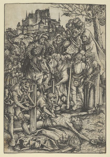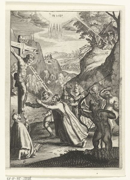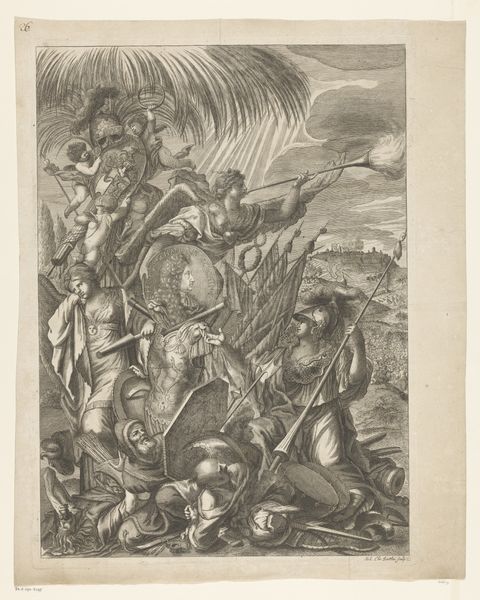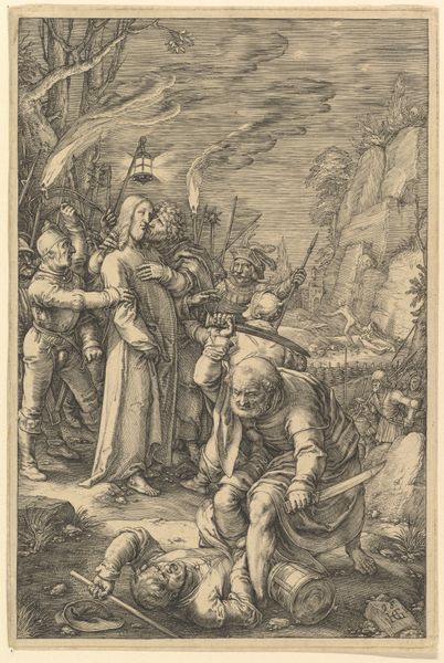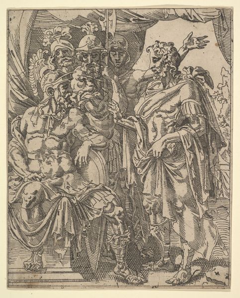 Curator: This is an engraving dating from between 1575 and 1645, portraying "Alexander the Great meeting Diogenes." It currently resides at the Metropolitan Museum of Art. Editor: What strikes me first is the sharp contrast between the refined figures surrounding Alexander and the reclined, almost animalistic Diogenes. The line work, though intricate, creates a stark division. Curator: And that division speaks to a larger point. Look at the historical context: an emperor, representing power and empire, encounters a philosopher known for rejecting societal norms. What does this encounter reveal about attitudes towards wealth, poverty, and philosophy during this period? What materials were readily accessible at the time to produce such prints for distribution and debate? Editor: Let's not disregard the visual cues that reinforce the theme of austerity versus opulence. Diogenes’ exposed torso is set against Alexander’s layered garments, further dividing the subjects into a state of want against aristocratic dress. Look at how Alexander's robe is carefully placed; the texture achieved through repetitive lines conveys weight and expense. The engraving focuses heavily on surface and texture to create this contrast. Curator: The act of producing a print, often duplicated and circulated widely, provided a way for historical narratives and moral lessons to reach wider audiences, challenging hierarchies of access. The economics of art creation and distribution need interrogation. How does making an artwork readily available speak to the culture that is represented in it? Editor: I’d argue that making prints makes artworks democratically available, but that should not blind us from understanding how the artistry shapes our reading of that specific culture through the rendering of form. Consider the architecture in the background, almost sketched in—yet its imposing nature gives scale to Alexander’s authority and Diogenes’ perceived isolation. It uses form to give shape to authority and rejection. Curator: But where do the skills and knowledge for architecture in the backdrop derive? Whose labor constructed this imposing backdrop and the symbolic capital it implies? What was the social class of those who built these structures and whose knowledge and experiences were reflected, or absent, in their design and construction? Editor: That’s fair; all aspects must be examined. Despite our divergent points of focus, there is room to agree about its visual impact and layered symbolic meaning—which invites us to look deeper. Curator: Precisely. There is much to examine here, from distribution to access to labor, to unpack social strata and biases—material conditions reflected by both patronage and production.