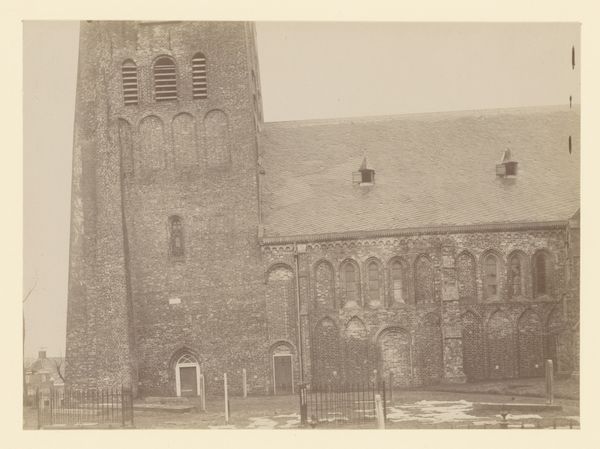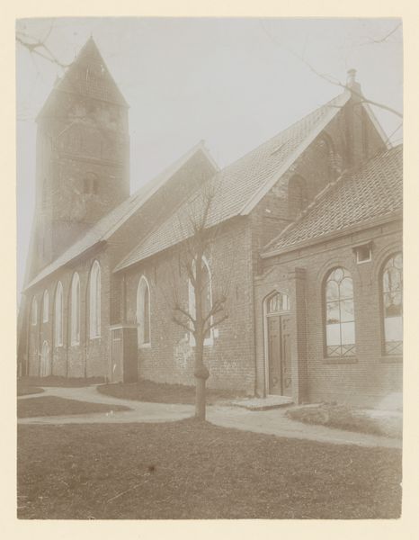 Curator: The image before us, titled "Gezicht op de Hervormde Kerk te Haren," captured in 1911 by an anonymous photographer, presents a rather solemn, almost spectral view. What strikes you most about it? Editor: A palpable stillness. The sepia tones imbue it with a dreamlike quality, and the bare trees only amplify a sense of coldness. I find myself drawn to the stark, brick architecture as well; it exudes strength. Curator: Yes, the anonymity of the photographer speaks volumes, actually. It suggests this was more about documenting the place, the architectural fabric, than making a grand artistic statement. Focus is brought to bear on the materials—brick, wood, stone—as the unadorned realities of the scene. Editor: Indeed, a spartan, almost puritanical aesthetic permeates the image. A sense of religious function takes hold. The upward reaching tower seems to beckon to an unyielding presence of higher power. But this visual message wouldn't stand as such, if not for a community's involvement. Curator: You've anticipated my thought precisely! Given that the artist has prioritized brick, which must be fashioned, and wood that needs shaping, the community’s involvement is brought to the fore; it underscores a crucial fact. Such sacred constructions represent considerable, co-operative labor investments. Editor: Right! Churches always strike me as incredibly powerful symbols, marking territory, consolidating beliefs, and acting as the physical manifestation of shared ideals within their particular environment. The structure transcends mere utility; the physical and symbolic become irrevocably intertwined. Curator: That makes me wonder, too: What were the immediate conditions under which it was created? Was it a symbol of hope amidst some economic hardships? Were materials locally sourced? Editor: Ultimately, an array of queries such as those would enrich any interpretation—I agree. A church facade can serve many faces at once! Curator: Exactly! These places evolve alongside their materials and methods. They hold our memories within their very foundations. Editor: This view into the past leaves me contemplating those lives intertwined within it. Thank you. Curator: Yes, and I find myself musing about labor; thanks to the image, all things come alive together—even labor in a small community.