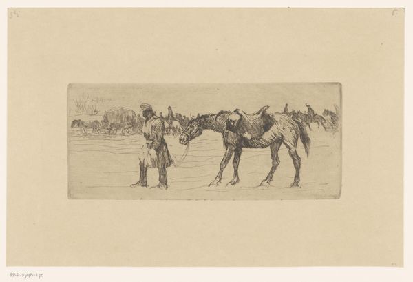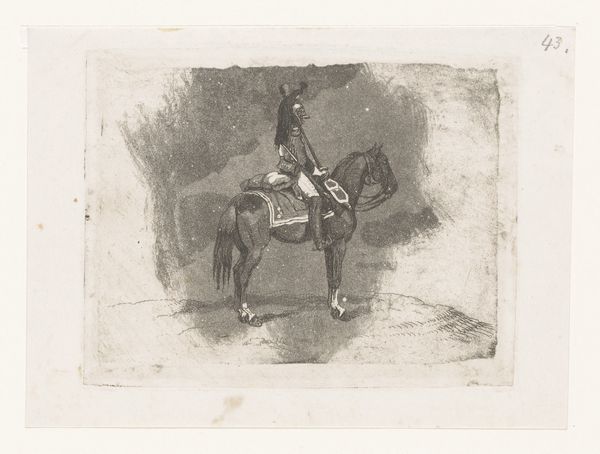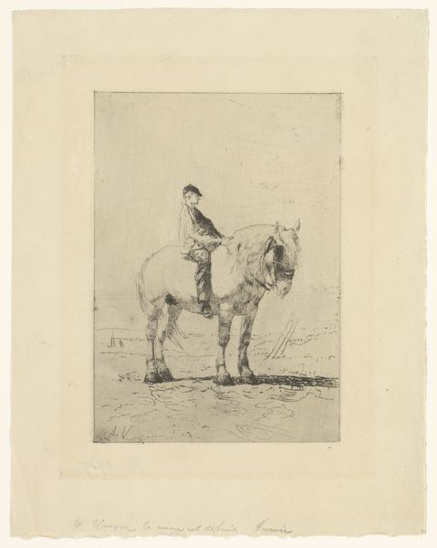 Editor: This etching, “Ruiter te paard,” or “Horse Rider,” by Vicomte Arthur-Jean Le Bailly d’Inghuem, dates to around 1870. The simple lines and soft shading create a quiet mood. What’s your read on this work? Curator: It's interesting to consider this work within the context of 19th-century European social hierarchies. The image presents a figure of authority and status, subtly reinforcing societal structures. Note how the artistic choices – the posture of the rider, the controlled energy of the horse, even the landscape in the background – serve to amplify a sense of power. Who do you think the image was made for? Editor: Someone who wanted to showcase their status? A member of the upper class perhaps? I guess these kinds of depictions could reinforce the social hierarchy of the time. Curator: Precisely. Etchings like this were often circulated amongst the elite. Now, how does the museum context influence our interpretation? Do we passively accept this depiction of power? Editor: I think museums play an important role in critiquing such power dynamics. By exhibiting such works alongside critical analyses, a museum can promote dialogue about historical inequalities. Curator: Yes, our interpretation is inevitably shaped by today’s values and socio-political context. And the act of displaying such a piece places it in a new, potentially critical light. What's one thing that you’ll take away from looking at this artwork in the museum context? Editor: That it's important to consider what’s included – and what's omitted – from depictions of power and status in the 19th century. Curator: Absolutely, and that critical perspective is invaluable.