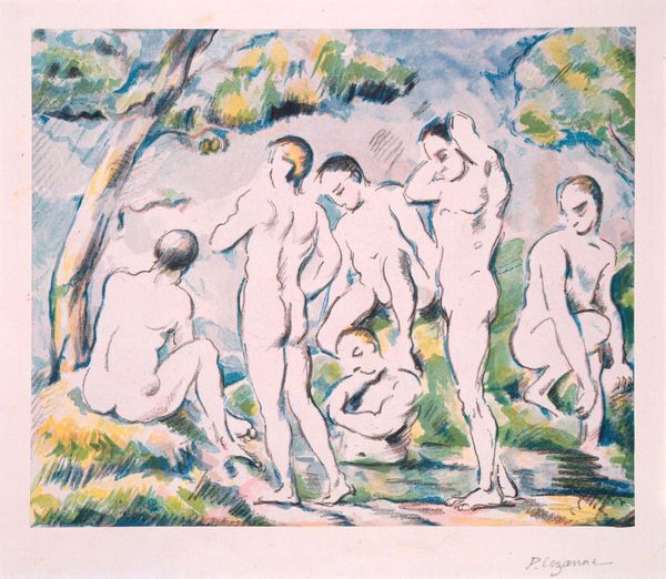 Curator: This watercolor and oil artwork is titled "Les Baigneurs – Petite planche" and was composed between 1896 and 1897 by Paul Cézanne. Editor: My immediate response is drawn to the rather stark contrast between the delicacy of the watercolor and the sharp lines defining these figures; it feels somewhat unfinished, like a sketch longing for more substance. Curator: Yet that supposed 'unfinished' quality is where so much of its historical interest resides. Cézanne, at this time, was challenging academic traditions of depicting the nude. Instead of idealized forms, we see a move toward abstraction and the breakdown of established hierarchies in painting. The theme of male bathers itself had significance within the French artistic circles and carried undertones of homoeroticism and references to classical antiquity. Editor: Indeed, and you can perceive Cézanne’s particular concern with form despite, or rather through, the chosen medium. He employs washes to sculpt bodies in a way that still asserts underlying geometry and a certain tension between surface and depth, which really captures his singular goal to rework Impressionism. Curator: It's vital to recognize that works like this helped usher in Modernism. By rejecting clear narratives and shifting focus onto the formal qualities, Cezanne influenced movements like Cubism and Fauvism, changing the direction of art history and allowing for further exploration of representation. Editor: Ultimately, this piece stands at the crossroads. We witness both the fading echoes of academic nude studies and a striking foreshadowing of 20th-century aesthetics. Despite any apparent crudeness, there is such an intellectual elegance and underlying geometry at work here. Curator: Absolutely. When looking at "Les Baigneurs – Petite planche," remember it wasn’t merely a depiction of men bathing but a bold proposition reshaping how art should engage with both tradition and modern life. Editor: Thank you. Looking at Cézanne from both angles has shed light on the piece, and it all begins to fall into place!