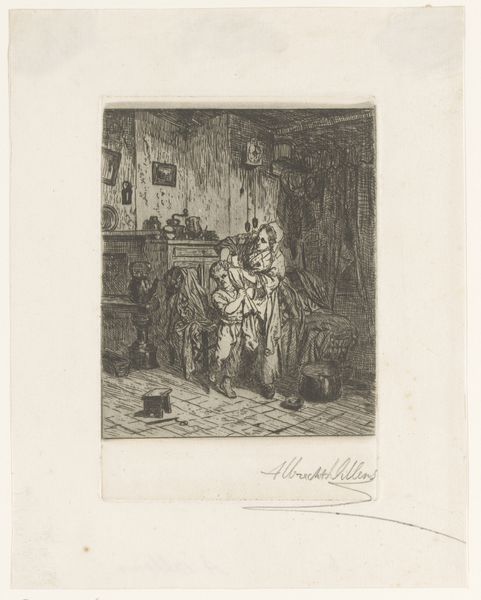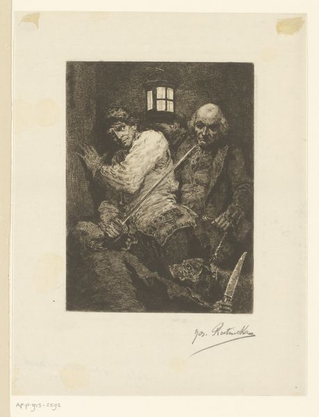 Curator: This intriguing etching by Jos Ratinckx, titled "Man defends himself with a sword against a man with lantern and dog," was created between 1870 and 1913. It’s an intaglio print on paper. Editor: The atmosphere is immediately striking – shadowy, tense, a narrative unfolding. The severe contrast emphasizes the drama and focuses attention on the struggle, despite the small scale. Curator: Indeed. The composition itself directs the eye through a sequence of figures, culminating in the point of conflict – the central man wielding the sword. Note how Ratinckx masterfully employs line weight. Thicker, darker lines delineate forms and emphasize weight and mass, contributing to the overall dynamism. Editor: Symbolically, the lantern's light seems to cut through more than just the darkness. Light, traditionally seen as knowledge and truth, confronts, even invades the primal energy represented by the canine figure. One has to ask, what truths are being defended here? Is it just the man with the sword protecting himself, or is he also standing against some societal injustice represented by the established figure holding the lantern? Curator: The figure with the lantern possesses an interesting form: his clothes suggest established power, and that suggests he represents order of a sort. But does the order threaten freedom, perhaps? Consider also the placement of the lantern: above the figure, perhaps signifying the guiding light of authority. The overall asymmetrical balance of light and dark contributes to a sense of impending violence, an off-kilter state that resonates strongly with contemporary viewers. Editor: It’s interesting to consider the dog as well. Dogs often represent loyalty and faithfulness, but in this image, its presence adds to the menacing undercurrent, a primitive and instinctive element unleashed, contrasting with the presumably reasoned motives of the lantern bearer. Is it meant to invoke our primordial fears? Curator: The medium itself, intaglio, etched with fine lines, serves to both conceal and reveal meaning. The hatching creates a depth, a dimension beyond mere representation, almost suggesting a moral ambiguity embedded in the scene itself. The very materiality of the piece—the incised lines— speaks to the painstaking effort to represent such dynamic struggle. Editor: Ratinckx uses the etching beautifully to not just create images, but evoke a specific cultural memory. One of clandestine struggles against perhaps hidden tyranny and the question of what truths we allow light and those we allow darkness. Curator: I agree, a closer examination certainly rewards with an interplay of technique, form, and an exploration of deeper social meaning. Editor: An unsettling tableau that stays with you.