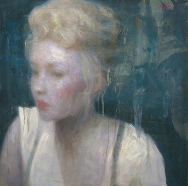 Editor: Here we have Joshua Flint’s oil painting "Eidolon," created in 2019. The subject matter is a ghostly nude figure that dissolves into an abstract background of mottled color. How do you interpret this work through a formalist lens? Curator: The dissolution you mention is precisely where the visual interest lies. Consider the figure itself. It is rendered with a limited palette, predominantly whites and grays, yet possesses a delicate luminosity. Observe how the artist uses abrupt, gestural brushstrokes to define form, then deliberately obscures those same forms with washes of color. Editor: Yes, I notice the push and pull between the representational and the abstract. What's the purpose of such ambivalence? Curator: Ambivalence is at the heart of it. Flint destabilizes traditional notions of representation by drawing our attention to the constructed nature of the image itself. We are not simply seeing a nude figure; we are seeing the act of painting. The subject matter is subjugated to form, or rather, it becomes form. Editor: So the nude becomes almost secondary to the execution. Does that mean the emotional impact is lessened? Curator: Not necessarily lessened, but certainly re-directed. Rather than focusing on the figure's subjective experience, we are invited to contemplate the materiality of the paint and the artist's process. The contrast between the solidity of the implied form and the fluidity of the background creates visual tension, and asks us to reconsider the very act of looking. Editor: I see it now. It's about the language of paint and image-making, not about portraying a classical ideal or a specific emotion. Curator: Precisely. It challenges us to read the painting for what it is: an orchestration of color, line, and form engaging in a dialogue with art historical precedents. Editor: Thank you. I am walking away understanding this painting’s visual and material impact. Curator: Indeed. And isn't that understanding a reward in itself?