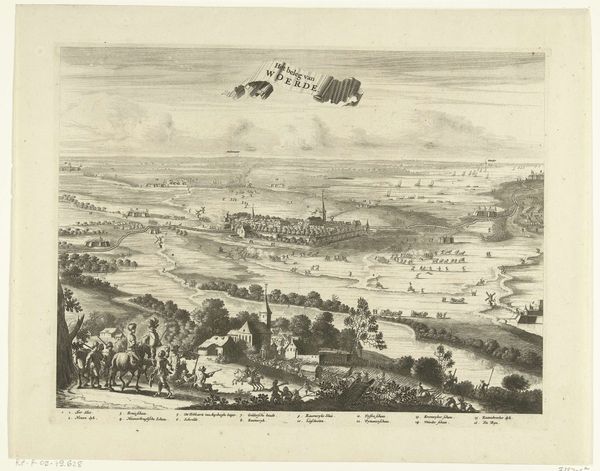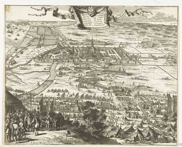 Editor: This engraving, "Beleg van Woerden, 1576," by Coenraet Decker, created between 1701 and 1703, presents such a detailed cityscape. It's fascinating how much information he packs into the composition. I’m curious, what structural elements strike you as particularly significant? Curator: Note how Decker establishes a visual hierarchy using linear perspective. The siege unfolds across the landscape, receding into the distance, guided by the river’s curve. This directs our gaze to the focal point—the town itself, depicted with geometric precision. Observe how the shapes interlock; the buildings’ rectangular forms contrasting with the organic lines of the land. Editor: It's like he's trying to impose order on a chaotic event. Is there any symbolism embedded in the use of such strong lines and geometric shapes? Curator: Indeed. The geometric layout mirrors the strategic military planning inherent in a siege. Each shape represents a unit of space, each line a strategic decision. Moreover, consider the negative space – the un-inked areas – framing the siege; it is not merely absence, but contributes to the visual tension, isolating Woerden as the object of conflict. The texture achieved through the etching creates tonal variations, enhancing the depth of the overall scene. Editor: I never thought about the negative space in that way before. So, the formal arrangement is not just about aesthetics; it conveys deeper meaning? Curator: Precisely. The interplay of lines, shapes, and space invites us to decipher the composition. Ultimately, the aesthetic becomes inseparable from its semantic weight. Editor: This close reading makes the artwork come alive! Thanks! Curator: My pleasure. The formal elements become a lens through which we understand not just the artwork but the historical moment it represents.