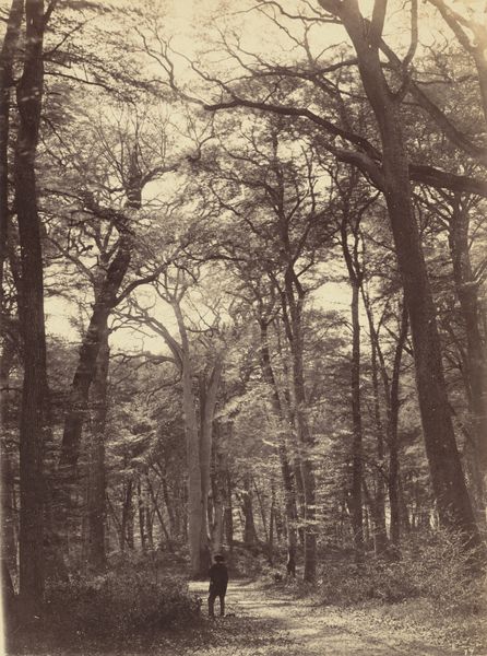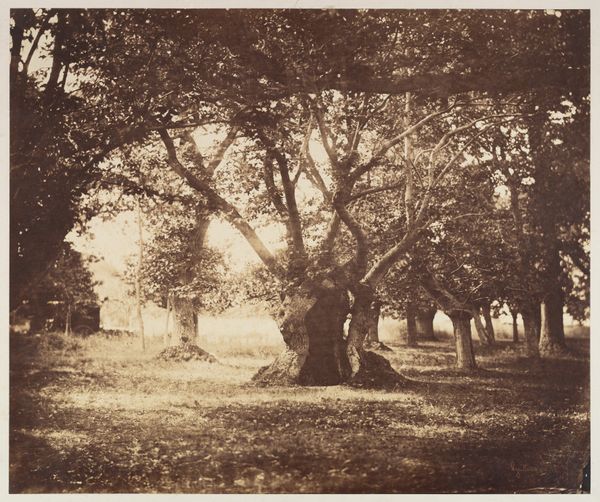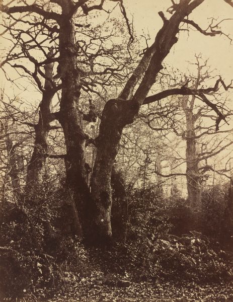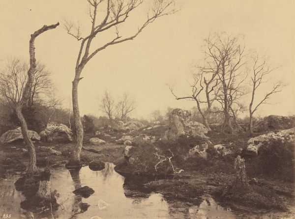 Editor: Right now we're looking at Lèon Gèrard’s "Landscape, Montebello," a gelatin silver print from around 1860. It's incredibly still. The light is diffused, the water looks almost like liquid smoke. What catches your eye the most about it? Curator: It's funny you say "still," because the blurred water feels so full of unseen energy, like the land itself is exhaling. But, beyond that palpable sense of place, I see Gérard wrestling with photography's role. Think about it – photography, barely a toddler, trying to be taken seriously as 'art'. Is it just a recording device, or can it capture something deeper? Editor: So, you're saying Gérard is intentionally blurring the line between documentation and… feeling? Curator: Precisely. That dreamy haze, that deliberate softness…it’s all about suggesting mood, emotion, a subjective experience. He isn't just showing us Montebello; he's whispering a secret about it. The monochrome palette really contributes too, don’t you think? It distances the work from reality, making it about suggestion and nuance. Editor: It definitely takes the image into another realm. And to think, this was 1860, so early in photography's history! I guess I hadn’t fully considered photography as something that wasn’t *always* trying to capture every single detail as accurately as possible. Curator: Photography, at its best, lets us play peek-a-boo with reality. Thank you, Léon Gérard! It definitely makes you appreciate how artistic the process of photography really is. Editor: It's given me a whole new way of looking at 19th-century photography. I came into this conversation expecting straightforward landscapes, and now I am looking at whispers and secrets.