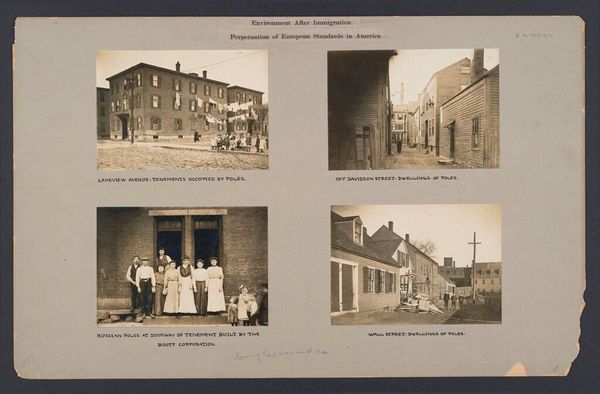 Editor: This photo, "Housing, Conditions," captures tenements in Lowell, Massachusetts, around the turn of the century. The stark black and white really emphasizes the crowded conditions. What stands out to you about the materiality and production of this image? Curator: This image serves as a document of immigrant labor and living conditions. The photographer, Hope, likely aimed to expose the realities of industrial-era housing. Notice the framing and the textual annotations; they highlight the exploitation inherent in perpetuating "European standards" in America. Who benefited from these living conditions and how? Editor: So, it's not just about the buildings, but about the social system that produced them? Curator: Precisely. The construction materials, the cramped spaces, the very act of photographing—all speak to a system of labor, immigration, and class. It challenges us to think about the relationship between the built environment and the people who inhabit and produce it.