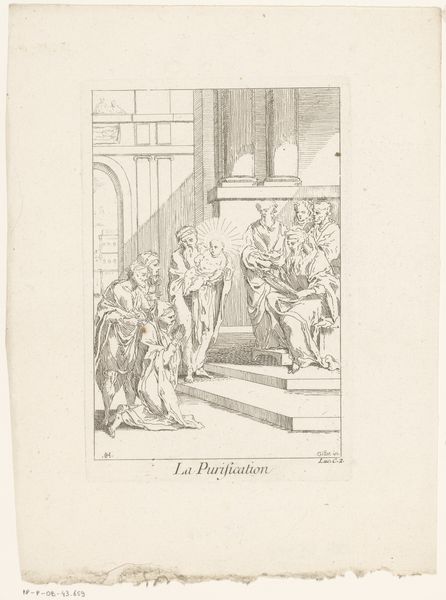 This print, depicting Christ and the woman taken in adultery, was made by Gabriel Huquier in the 18th century. It’s an etching, meaning that the image was created by drawing into a wax ground on a metal plate, and then bathing the plate in acid. The acid bites into the metal where the wax has been removed, leaving incised lines that hold ink. The character of those lines is crucial here; see how they create a wiry, almost nervous effect, particularly in the drapery folds. Huquier was a reproductive printmaker, meaning that he made his living by translating the designs of other artists into this graphic medium. The image could then be widely distributed and consumed. The etching process allowed for the relatively quick production of multiple images, making art more accessible to a broader audience. This commercial aspect is significant; it reflects the increasing commodification of art in the 18th century, and the rise of a market driven by consumer demand. While etching may not have the same aura as a unique painting, it allowed for the dissemination of ideas and images, contributing to the vibrant cultural landscape of the time. It bridges the gap between fine art and the wider world of commerce and consumption.