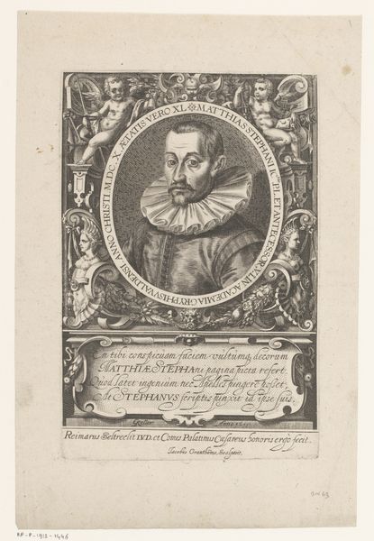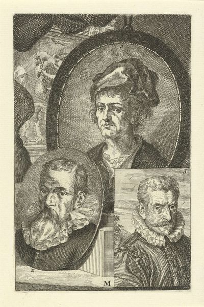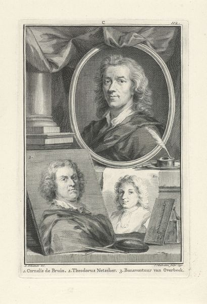 This print, by Jacob Houbraken, presents three artists arranged vertically, each framed within distinct shapes. The etching technique creates a play of light and shadow that models their faces and clothing. The composition is structured by the varied framing devices: an ornate oval, a simple circle, and an implied square, that compartmentalize each artist. This layout could be interpreted through structuralist ideas about categorization. The frames not only separate the figures but also invite comparison, like elements in a semiotic system where meaning arises from differences. The choice of shapes and their arrangement suggests a hierarchy, perhaps reflecting artistic status. Houbraken’s organization of space and form reflects broader concerns about representation and the construction of artistic identity. Each portrait, with its distinct frame, operates as a sign contributing to a larger narrative about art and its makers. The etching exemplifies how formal choices function aesthetically and contribute to complex cultural and philosophical discourses, reflecting the ongoing interpretation of art.
