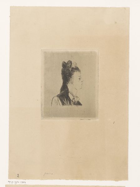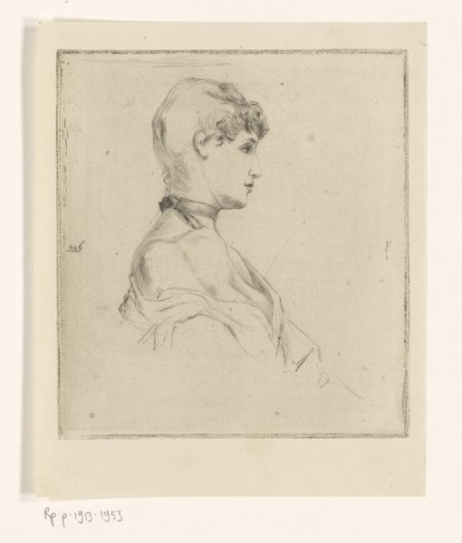Editor: Here we have Axel Hou's "Portrait of a Young Girl" from 1899. It's a pencil and etching piece. The delicate lines give it such a gentle, almost ephemeral quality. What stands out to you in its composition? Curator: Formally, I am drawn to the interplay between line and negative space. Notice how the artist utilizes delicate hatching and cross-hatching to define the contours of the figure. This technique, coupled with the restraint in detail, allows the viewer to complete the image conceptually. How does the subject's gaze contribute to your reading of the work? Editor: I hadn't really focused on her gaze, but now I see that she's not making eye contact; it suggests introspection or perhaps a dreamlike state, almost like she is lost in thought. Curator: Precisely. This averted gaze, combined with the simplified rendering of facial features, allows for a universality in the portrayal. We are presented with a figure that embodies youth and potential without being anchored to a specific identity. Note how the artist renders the hair; how might the hairstyle signify not just aesthetic choices, but societal values? Editor: It seems quite elaborate, but still relatively simple for that time, like a subtle nod to societal expectations without fully embracing them. Curator: A perceptive observation. The success of this portrait lies not only in its technical proficiency but also in its ability to evoke a mood and invite contemplation through formal means. Editor: It is remarkable how much can be conveyed through such subtle choices in line and composition. Thank you, I definitely see more complexity now. Curator: Indeed. The careful articulation of form speaks volumes about the artist's engagement with the intrinsic language of art.