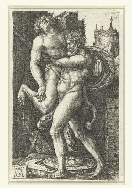Editor: So, this is Hans Brosamer's "Hercules slaying Antaeus," an engraving from 1540. It feels incredibly dynamic for a print, like I can almost feel the struggle. What strikes you about it? Curator: Well, beyond the impressive technique, I think it is imperative to consider how this image participates in the construction of heroic masculinity within the context of the Northern Renaissance. Look at how Brosamer positions Hercules. What societal values do you think he might be reinforcing, or perhaps even subtly questioning? Editor: Hmm, reinforcing… definitely strength, and maybe some kind of divine right? I mean, he’s Hercules. I suppose there’s also the element of civilization versus barbarism, given Antaeus’ wildness. Is it odd to see these gods from antiquity pop up during the renaissance? Curator: Not at all! The Renaissance saw a revival of classical learning and imagery. However, the crucial question is: How are these classical figures being *re-interpreted* to suit 16th-century concerns? Consider, for instance, the rise of printmaking as a means of disseminating imagery. Who had access to these images? How did these portrayals of strength play into political or religious agendas? Editor: That’s fascinating, considering printed images spread quickly; it must’ve been a powerful tool to project an image of authority back then. I hadn’t really considered that. Thanks! Curator: Precisely. And this piece really underscores the necessity to read artworks not as isolated creations, but as active participants in their historical milieu. I learned a new approach too. Seeing this in relation to societal perspectives and the growth in mass visual communication techniques highlights some complexities.