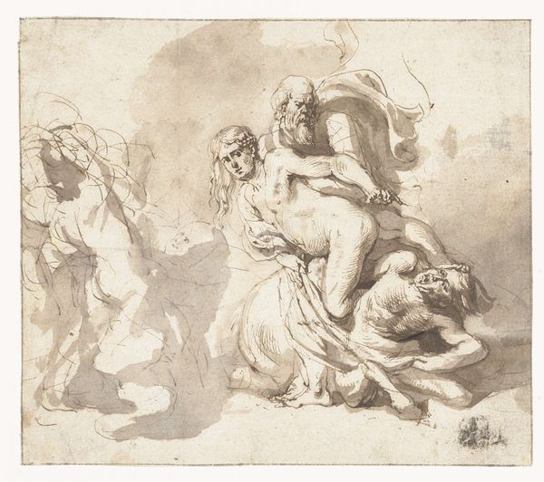 This drawing, "Two Sleeping Figures", was made with pen and brown ink, heightened with white, over red chalk on paper by an anonymous artist. It is quite revealing to consider the materials. Red chalk would have been made by grinding down a soft, earthy stone; it’s a very direct way of making a mark. The ink also has a natural origin, derived from tannin and iron salts; the artist would have dipped a quill into this mixture, drawing quick, dark lines. The addition of white heightening is a painterly touch, like adding highlights in oil. The use of these media suggests this was a sketch, perhaps a study for a larger composition, a way for the artist to think through a subject. It reminds us that even the greatest Renaissance masterpieces were built on a foundation of humble materials and processes. The artist's hand is evident in every stroke.