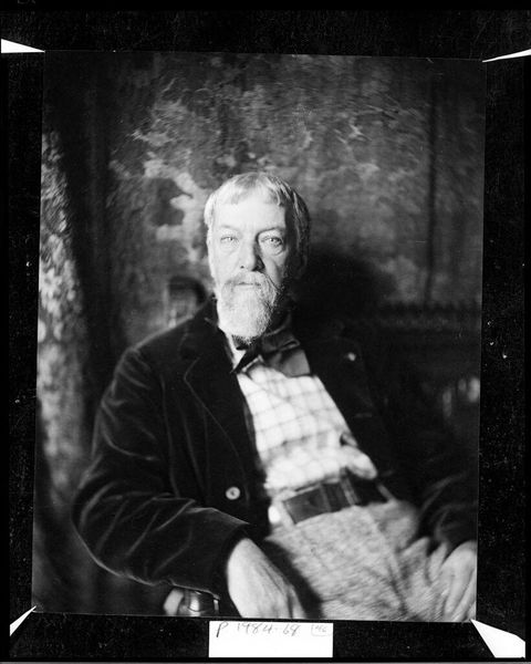 Curator: Charles Sydney Hopkinson painted this portrait of Barrett Wendell, a Harvard professor, sometime in the early 20th century. Editor: The somber tone immediately strikes me—it’s a powerful, almost melancholic image, isn't it? The dark background seems to swallow the figure. Curator: Absolutely. Wendell was a complex figure, a symbol of the old guard challenged by evolving social and intellectual currents. The portrait seems to capture that tension. Editor: The book under his hand… It represents not just knowledge but tradition, the weight of the past. The light focuses there, and on his face, almost as if to say that this tradition is now his burden. Curator: Precisely. He grappled with modernism, with shifting views on race and class. This portrait reflects the anxieties of a changing world. Editor: The painting is saying something about how identity is negotiated against the backdrop of inherited symbols. Food for thought. Curator: Indeed, it is a potent study of a man at a cultural crossroads.