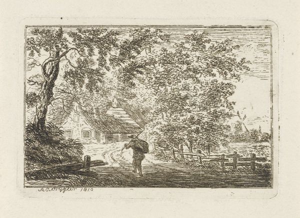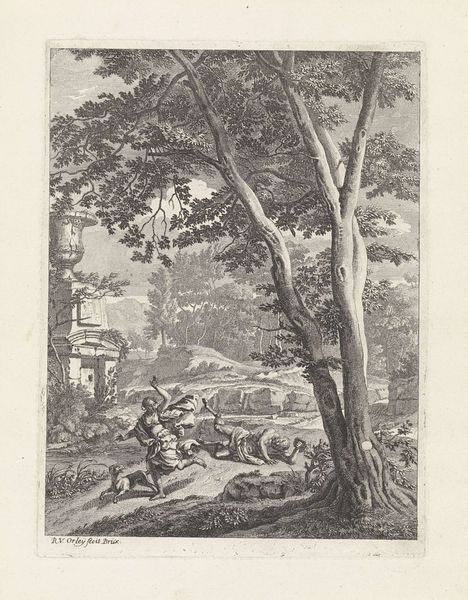 Jan Lamsvelt created this print, "Ontmoeting in een bos," or "Encounter in a Forest," at an unknown date in the Netherlands. The imagery presents an intriguing social tableau ripe for historical investigation. Lamsvelt’s depiction of a meeting amidst a wooded landscape raises questions about Dutch society and its relationship to trade, power, and perhaps even illicit dealings, given that the location seems to be in secret. The presence of a ship in the background invites reflection on the Netherlands' maritime power in the 18th century, a time when the Dutch Republic was a major player in global trade and colonization. Historians might consult period documents such as trade records, letters, and even legal archives to better understand the context of such encounters, as well as the institutional histories of Dutch trade and governance. Such investigations highlight the importance of social context in shaping artistic meaning, challenging us to consider how historical forces shape art, and how art, in turn, reflects and comments on its own time.
